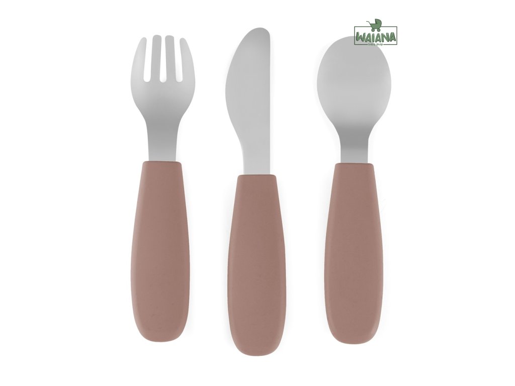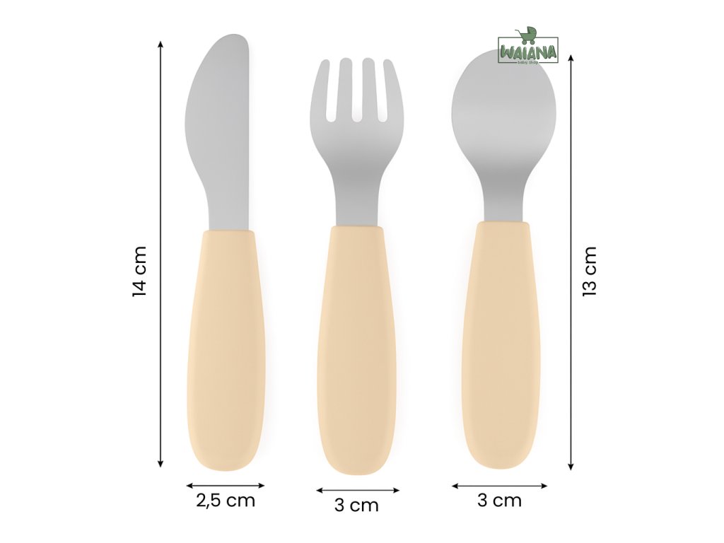 Funkčné časti sú vyrobené z kvalitnej nehrdzavejúcej ocele, rukoväte sú ergonomické a potiahnuté mäkkým silikónom vhodným na kontakt s potravinami – ideálne prispôsobené detským rúčkam. To zaručuje pohodlný a istý úchop a podporuje správne stravovacie návyky.