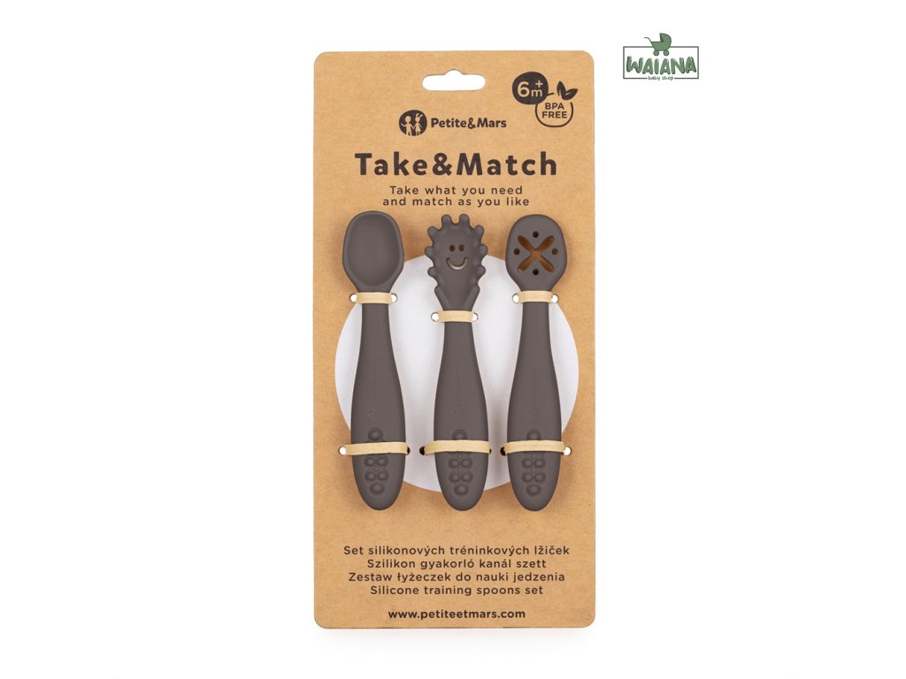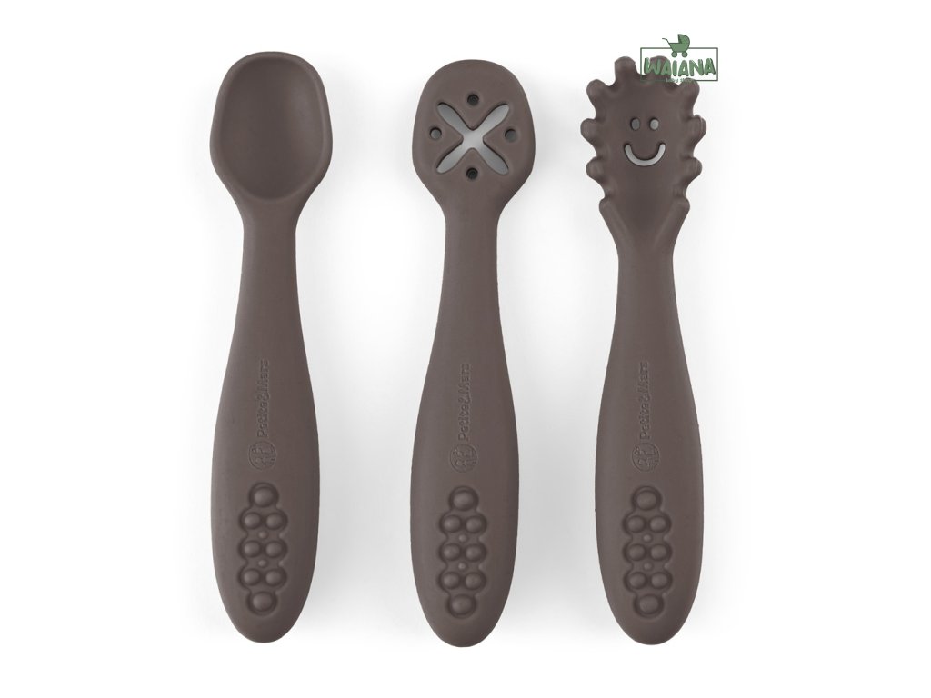 PETITE&MARS Set 3 ks silikónových tréningových lyžičiek Take&Match Bitter Cocoa 6m+