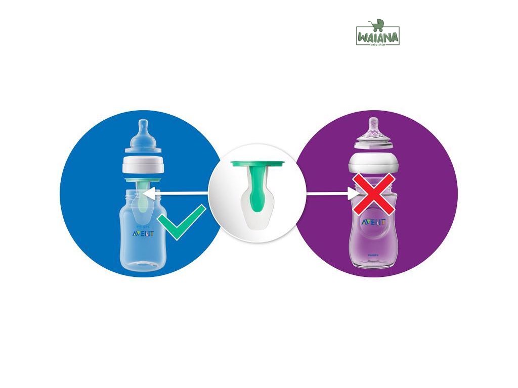 Klinické štúdie preukazujú, že fľaše AVENT značne znižujú koliku a nepokojné a podráždené správanie. Jedinečný pružný okraj cumlíka umožňuje pri kŕmení prúdenie vzduchu do fľaše, a to predchádza vytváraniu vákua vo fľaši. Dieťa si samo kontroluje tok mlieka rovnako ako pri dojčení. Počúvajte jemný, šumivý zvuk a sledujte vzduchové bubliny praskajúce na hladine mlieka. To sú dôkazy toho, že vzduch prúdi do fľaštičky a nie do bruška dieťaťa.