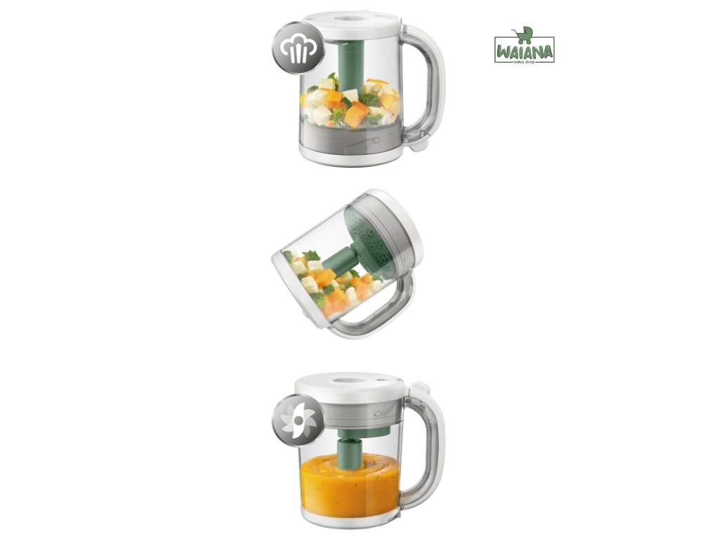 Varte v pare, miešajte a mixujte - všetko potrebné k príprave výživnej detskej stravy v jedinej nádobe. Keď budú ingrediencie podusené, stačí len odklopiť veko nádoby, otočiť ho a upevniť v obrátenej polohe. Potom už všetko len rozmixujte na požadovanú konzistenciu.