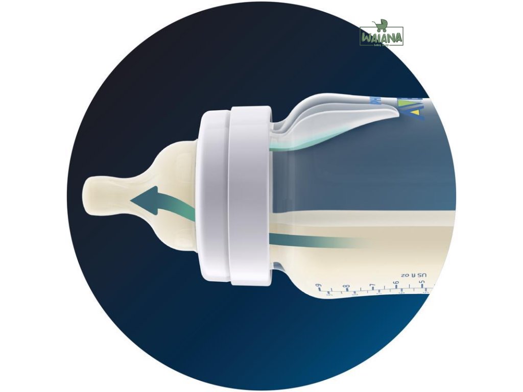 Antikolikový systém sa nachádza v cumlíku AVENT. Jedinečný pružný okraj cumlíka umožňuje pri kŕmení prúdenie vzduchu do fľaše a nie do bruška dieťaťa. Dieťa si samo kontroluje tok mlieka, rovnako ako u prirodzeného kojenia.