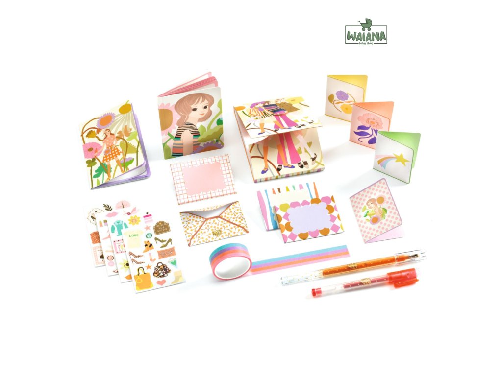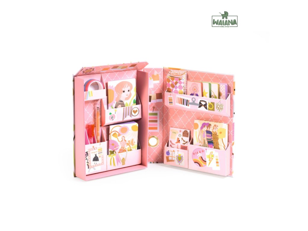 Sada Tinou od DJECO je dizajnová, ľahko prenosná "knižka" z kolekcie LOVELY PAPER. Puzdro sa otvára ako kniha a odhaľuje niekoľko priehradiek, v ktorých sa nachádza kompletný set papierenských potrieb. Táto kreatívna pokladnica s módnou tematikou je ideálna na zapisovanie myšlienok, tvorenie pohľadníc alebo zdobenie poznámok, pričom všetko zostáva krásne usporiadané a vždy po ruke.