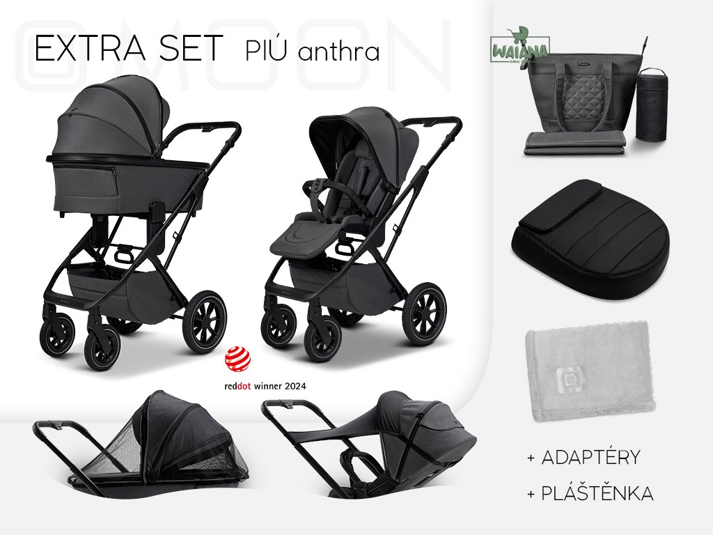 Výhodná sada PIÚ EXTRA obsahuje nánožník black na sportovní verzi, přebalovací tašku v barvě kočárku, moskytiéru, sluneční clonu, luxusní teplou deku MOON, pláštěnku a adaptéry na autosedačku. Barva zobrazeného produktu se může lišit od originálu.