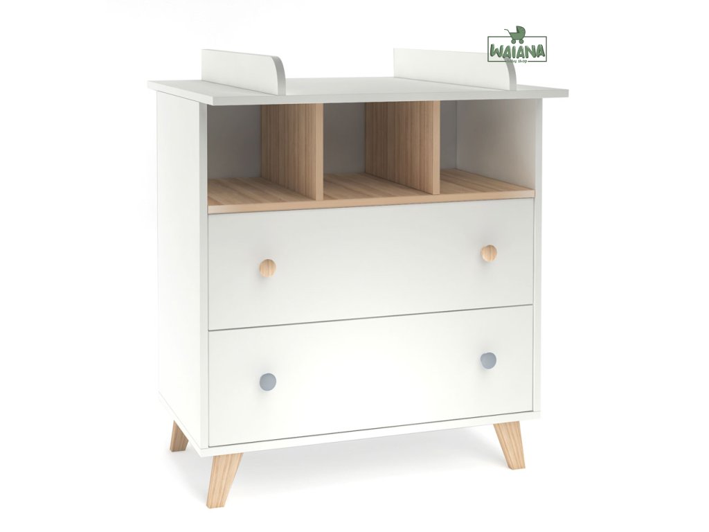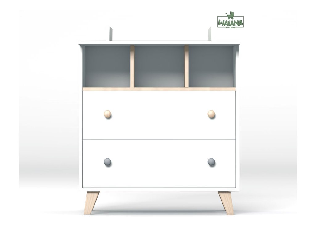 Komoda poskytne dostatok miesta na všetko potrebné pre Vaše bábätko, v hornej časti je otvorená polička pre veľmi frekventované potreby alebo pre veci, po ktorých potrebujete siahnuť ospalá poslepiačky, nižšie dva šuplíky chrániace veci pred prachom. Komoda je optimálne vysoká pre pohodlné prebaľovanie. Súčasťou dodávky je prebaľovací nadstavec, ktorý neskôr môžete odmontovať a komodu ďalej používať bez neho.