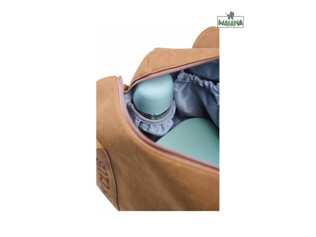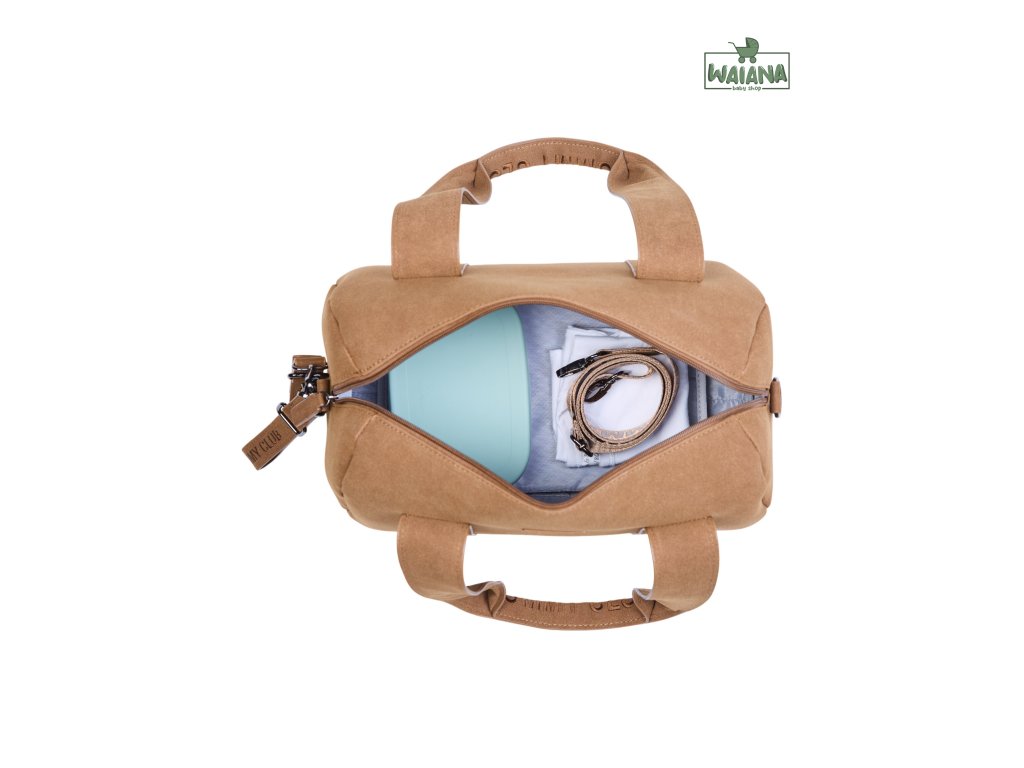 Přebalovací taška s uzavíráním na zip je vybavena držadly pro nošení v ruce, popruhem pro nošení přes rameno i úchyty pro zavěšení na kočárek.