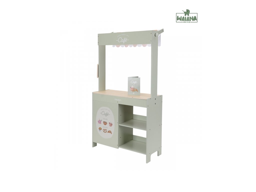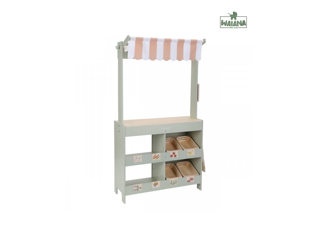 Krásne spracovaný predajný stánok Little Dutch je skvelý základ pre obľúbenú hru na obchod, pri ktorej sa fantázii medze nekladú! Deti si môžu zahrať na predavača čerstvej zeleniny a ovocia alebo obsluhovať hostí vo svojej vlastnej cukrárni plnej sladkých dobrôt.Vďaka šikovnému obojstrannému dizajnu sa farmársky stánok ľahko premení na štýlovú kaviareň. Na jednej strane nájdete predajný pult, pruhovanú markízu, textilnú nákupnú tašku a dostatok miesta na vystavenie tovaru vrátane štyroch debničiek na ovocie a zeleninu. Po otočení stánku sa otvorí kaviarenská časť s ilustrovaným menu a štyrmi výstavnými priehradkami na zákusky.