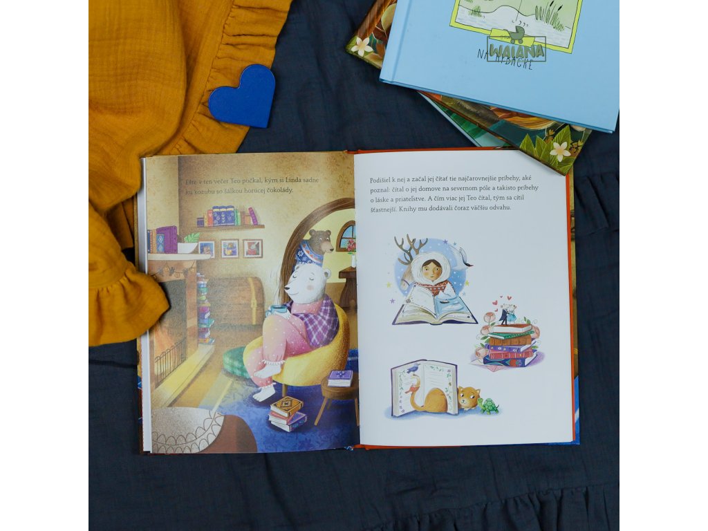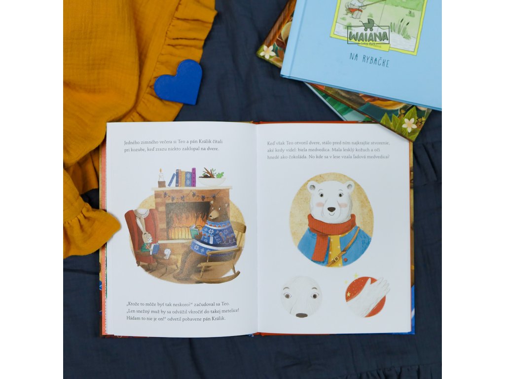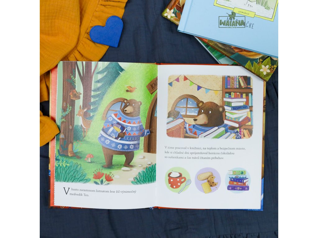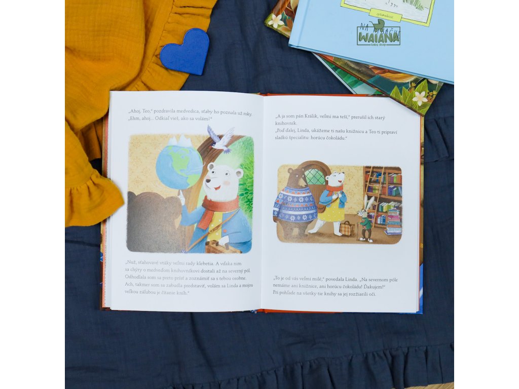 Prekvapenie pre knihovníka TeaPríbeh o knihovníkovi Teovi a nečakanom stretnutí, ktoré mu obrátilo život naruby.Medvedík Teo si šťastne nažíval v knižnici aj s pánom Králikom, starším knihovníkom, ktorý ho naučil tomuto krásnemu remeslu. Jeden večer, keď vonku za oknom zúrila víchrica, sa zrazu ozvalo nesmelé zaklopanie na vchodové dvere. Za nimi stálo krásne, čarovné stvorenie – biela medvedica.Podarí sa nakoniec medvedíkovi zo zvláštnej choroby vyzdravieť?Najskôr sa Teo nečakanej návšteve veľmi potešil, no odkedy medvedica Linda prišla do zimnej knižnice a Teovho života, Teo sa zmenil. Nemal vôbec hlad, akosi zvláštne ho bolelo bruško a takmer nedokázal súvislo rozprávať...