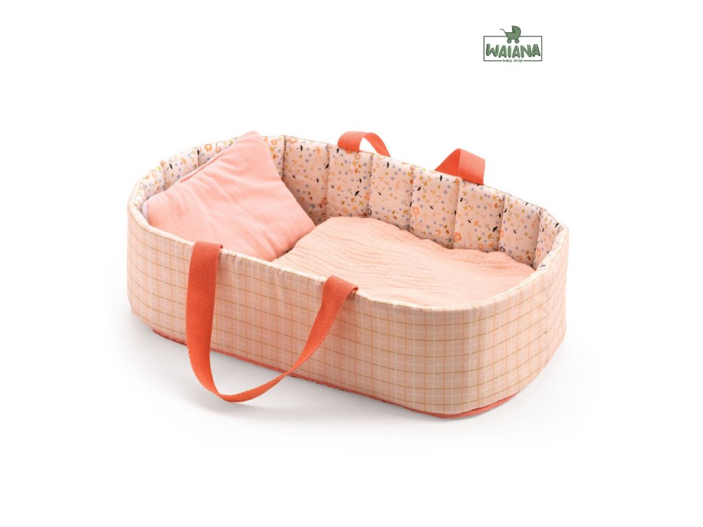 Prenosná postieľka pre bábiky A ide sa na výlet s bábikou! Ľahké pohodlné hniezdočko pre bábiky veľkosti 30-36 cm. Hniezdočko s dvoma bočnými držadlami je praktickou prenosnou postieľkou, v ktorej môže bábätko bezpečne oddychovať.Postieľka z prešívanej bavlny je ľahká. Súčasťou je vankúšik a prikrývka z podšitej bavlny. Farby a vzory použitých látok sú vkusne zladené. Obsah: 1 hniezdočko, 1 vankúšik, 1 prikrývka. Rozmery: 36 x 22 x 10 cm.