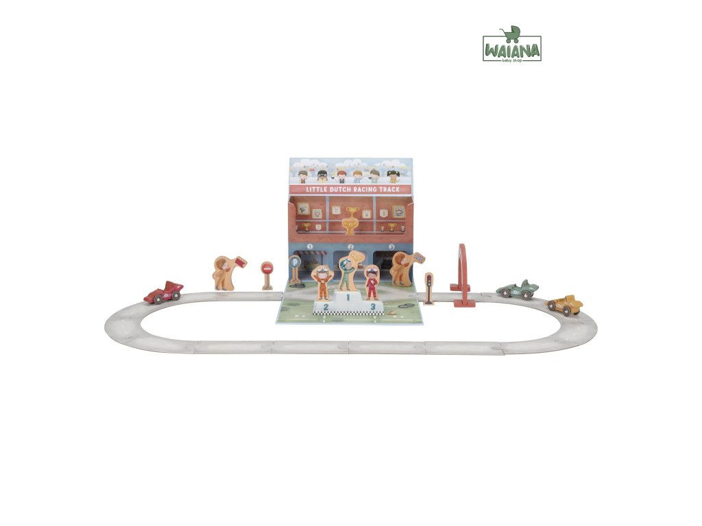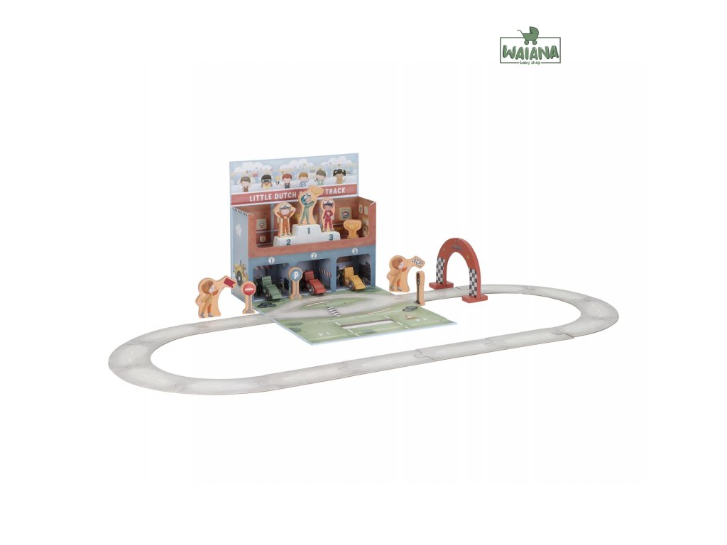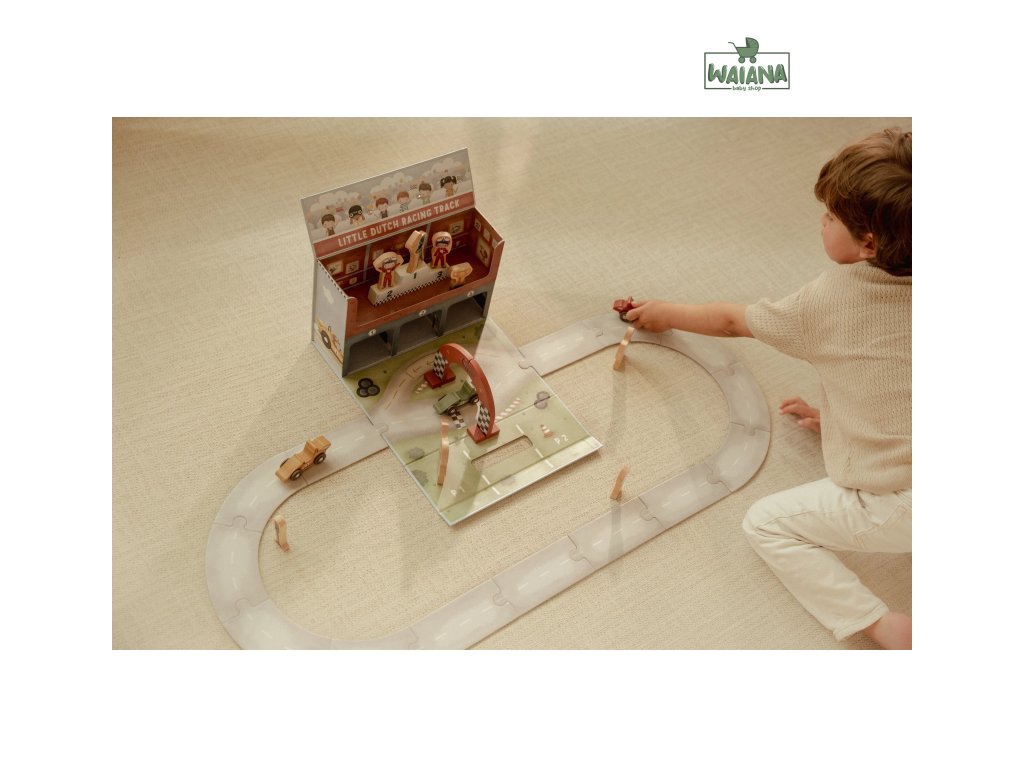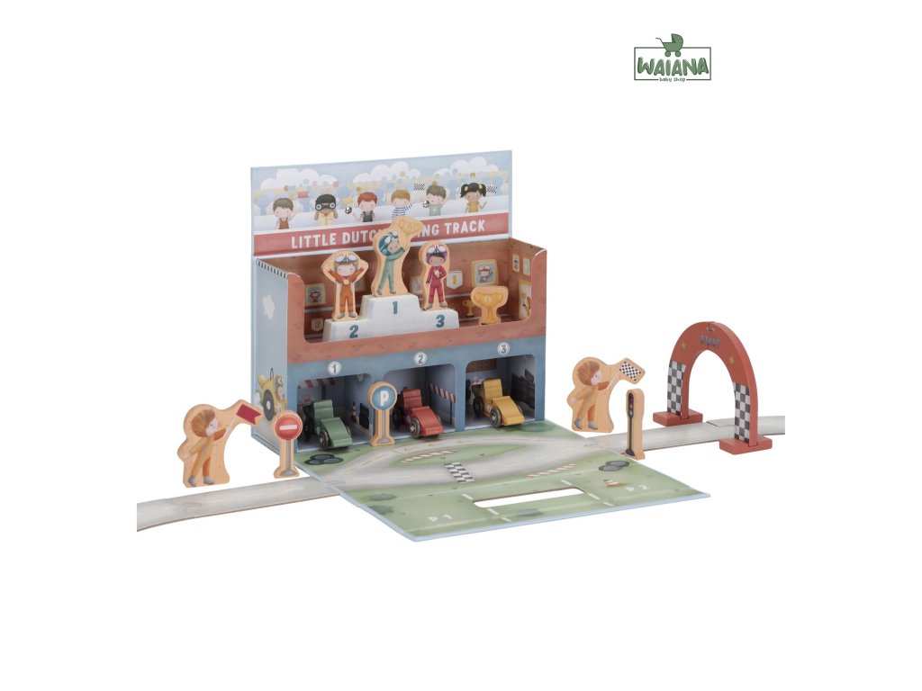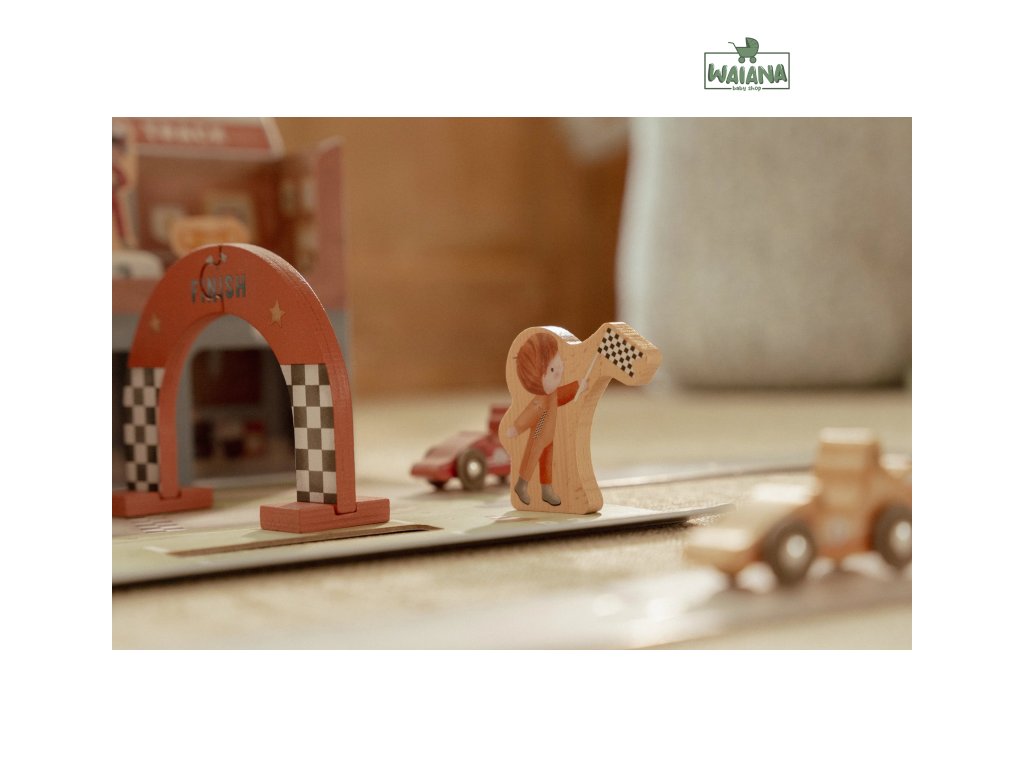 Naštartujte motory, preteky začínajú! Táto pretekárska dráha Little Dutch ukrytá v praktickom kufríku sa behom chvíľky premení na kompletnú autodráhu plnú akcie. Sada obsahuje všetko, čo malí pretekári potrebujú k vzrušujúcemu zápoleniu – drevené pretekárske autá s vodičmi, cieľovú pásku, dopravné značky, stupne víťazov aj zlatý pohár pre šampióna.