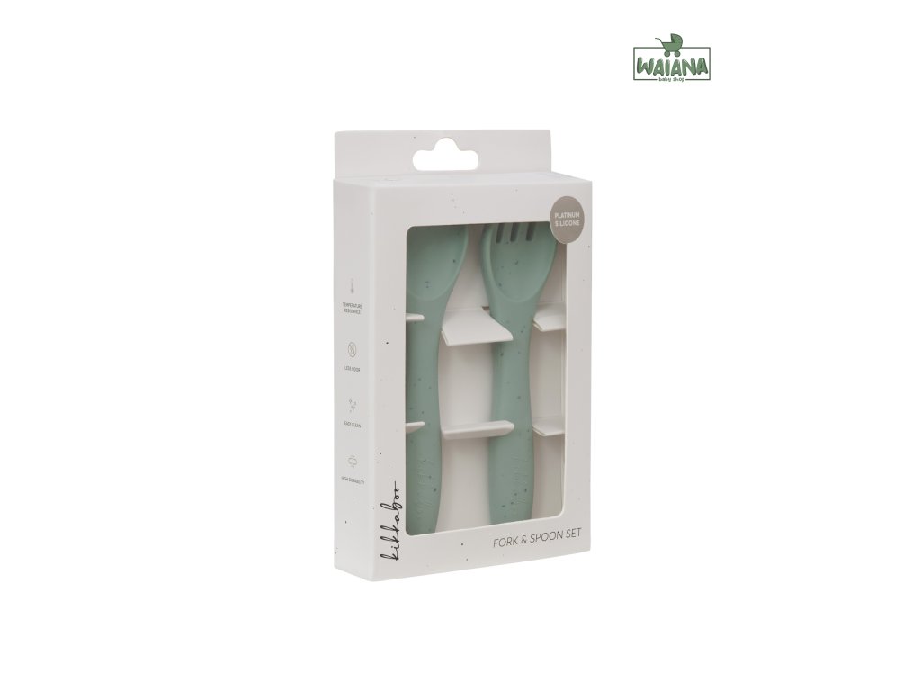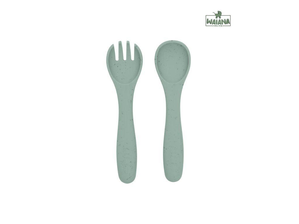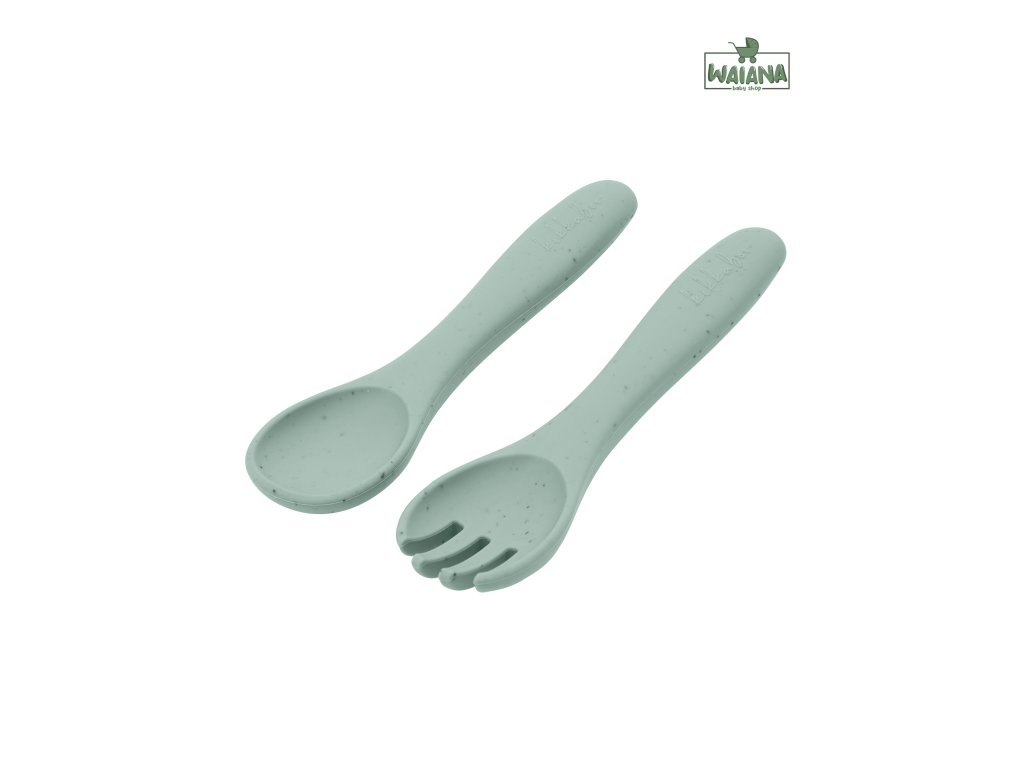 Dětský příbor pro první samostatné krmení KikkaBoo Platinum Silicone tvoří vidlička a lžička z bezpečného materiálu šetrného k dětským dásním.