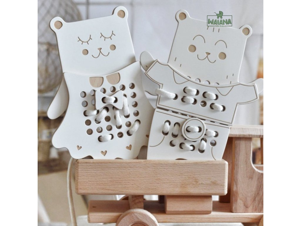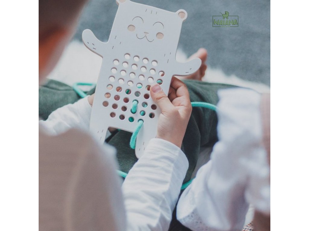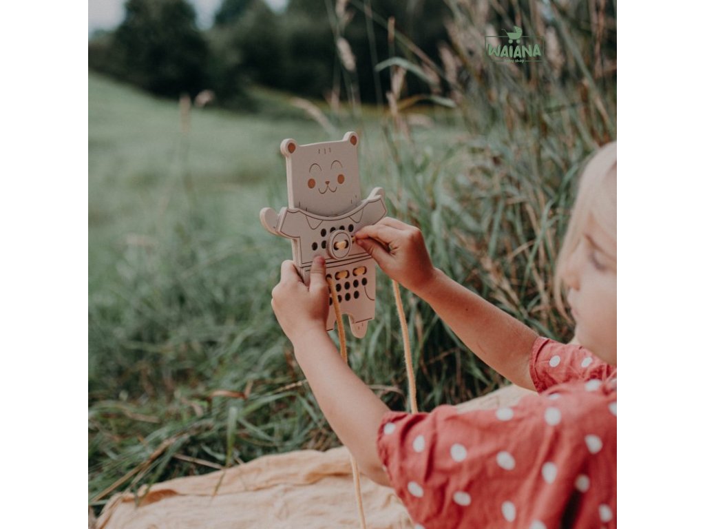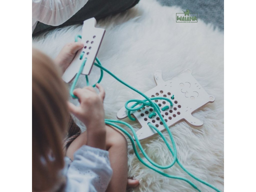 Drevená prevliekacia hračka rozvíjajúca kreativitu a predstavivosť. Prezliekanie zvieratiek šnúrkami predstavuje nielen radostný spôsob zábavy, ale zároveň napomáha v príprave detí na písanie v škole. Rozvíja manuálnu zručnosť a jemnú motoriku. Tréning koordinácia oko-ruka podporuje jazykové zručnosti a vytváranie nových nervových spojení v mozgu.