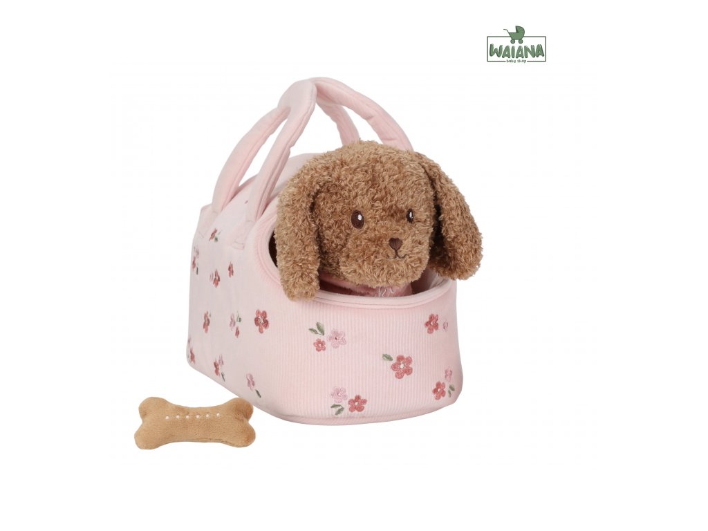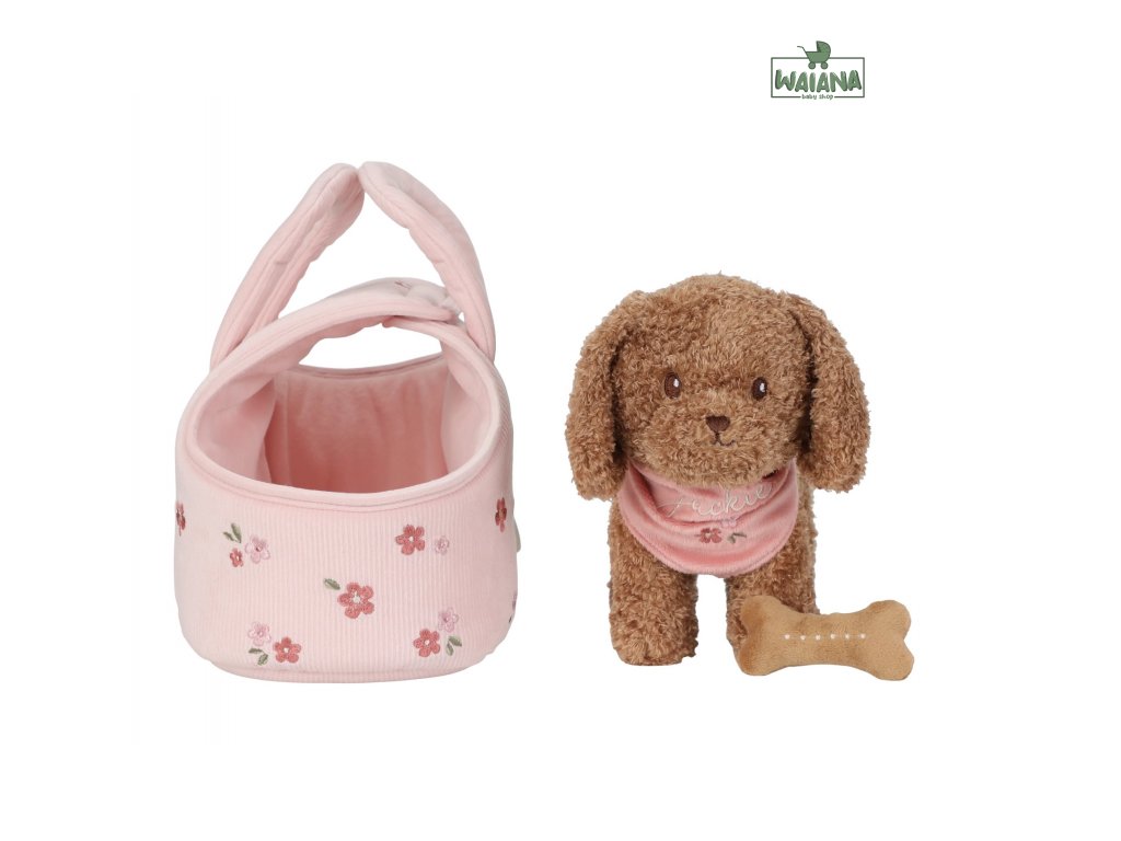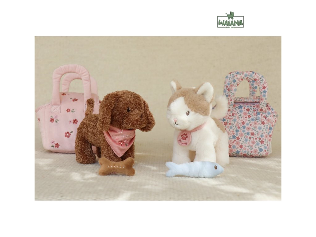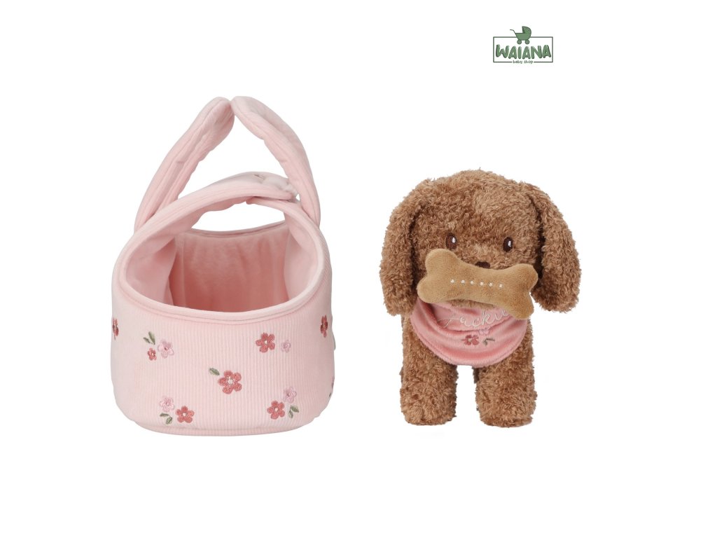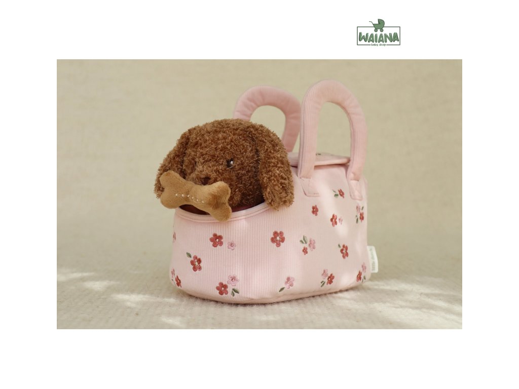 Psík prichádza v elegantnej kvetovanej taške s predným otvorom, aby mohol zvedavo vykukovať von. Vďaka tomu si ho deti môžu vziať kamkoľvek – na prechádzku, na výlet, do škôlky alebo napríklad k starým rodičom. Okolo krku má uviazanú šatku so svojim menom. Plyšová kosť na hranie má vo vnútri magnet, takže drží psíkovi pri papuľke.