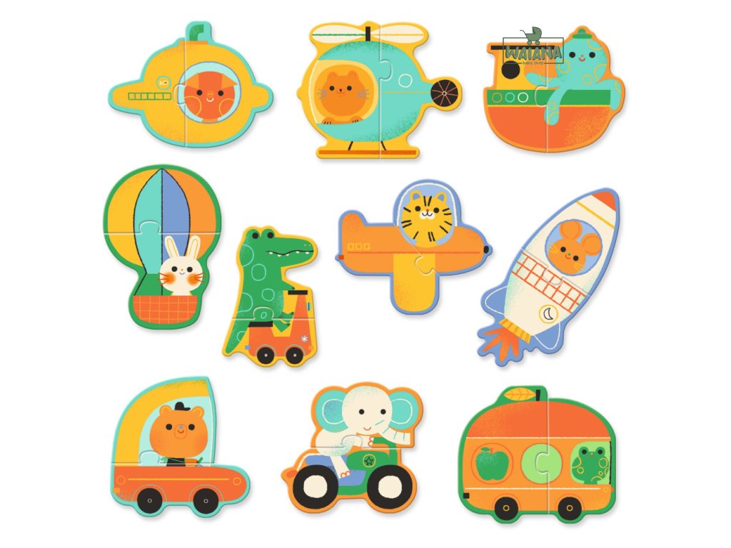 Puzzle Duo Dopravné prostriedky 10 ks Prvé puzzle pre malých fanúšikov áut a strojov Vydaj sa na dobrodružstvo plné áut, lietadiel a ďalších dopravných prostriedkov s edukatívnym puzzle Djeco Duo! Táto sada 10 dvojdielnych skladačiek je navrhnutá špeciálne pre malé detské rúčky od 2 rokov. Každé puzzle pozostáva z dvoch dielikov – deti sa učia priraďovať správne kombinácie, čím si rozvíjajú jemnú motoriku, logické myslenie a vizuálne vnímanie. Vďaka samoopravnému systému puzzle zapadne len tá správna kombinácia. Ideálne na prvé zoznámenie s puzzle svetom!