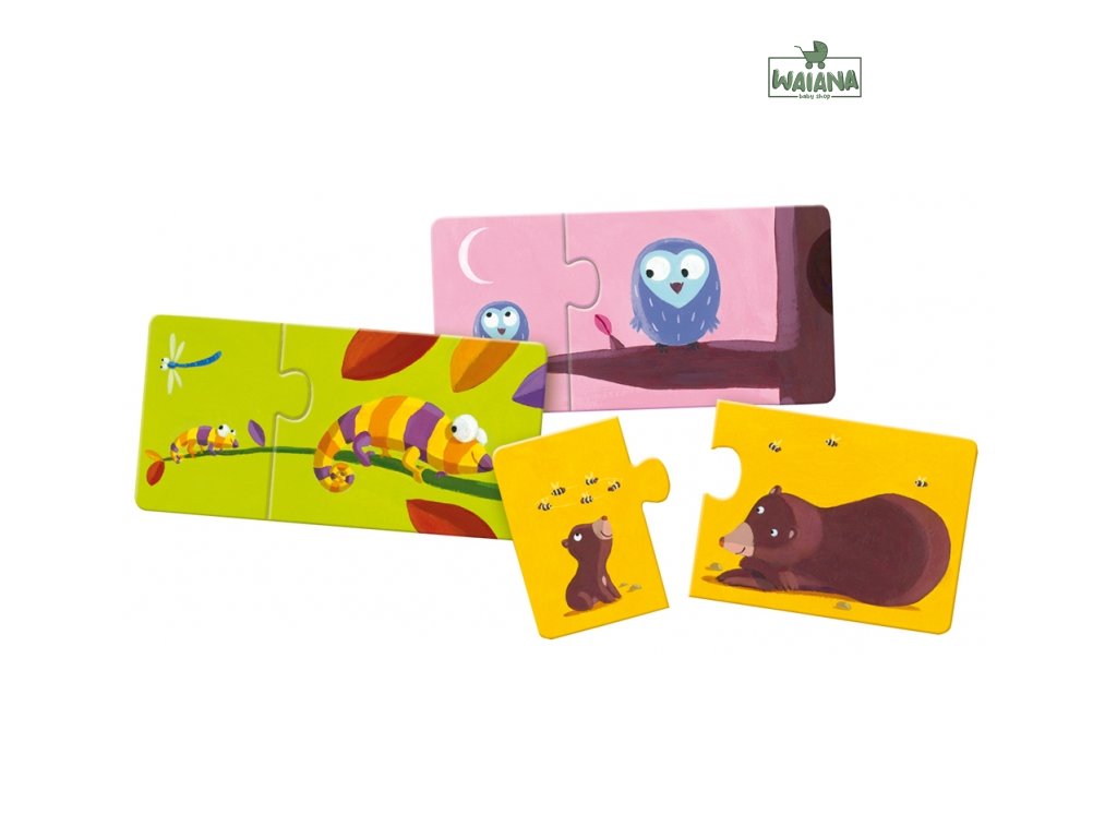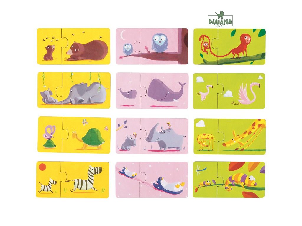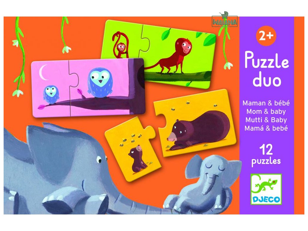 Puzzle duo Mláďatká Daj mláďatko dohromady s jeho mamičkouVďaka krásnemu ilustrovanému Puzzle Duo Mláďatká od Djeco si deti budú cvičiť pozornosť, ale naučia sa aj niečo o tom, ako vyzerajú mláďatká obľúbených zvieratiek. Balenie obsahuje 24 dielikov puzzle, z ktorých vytvoríte 12 puzzle obrázkov zobrazujúcich mláďatko a jeho mamičku pohromade.Deti si rozvíjajú slovnú zásobuPuzzle je skvelé na rozvoj kreativity a jemnej motoriky. Je jednoduché, takže je skvelé už pre deti od dvoch rokov. Deti sa učia pomenovávať zvieratká a zároveň zistujú, ako vyzerá mláďa a ako dospelý jedinec.