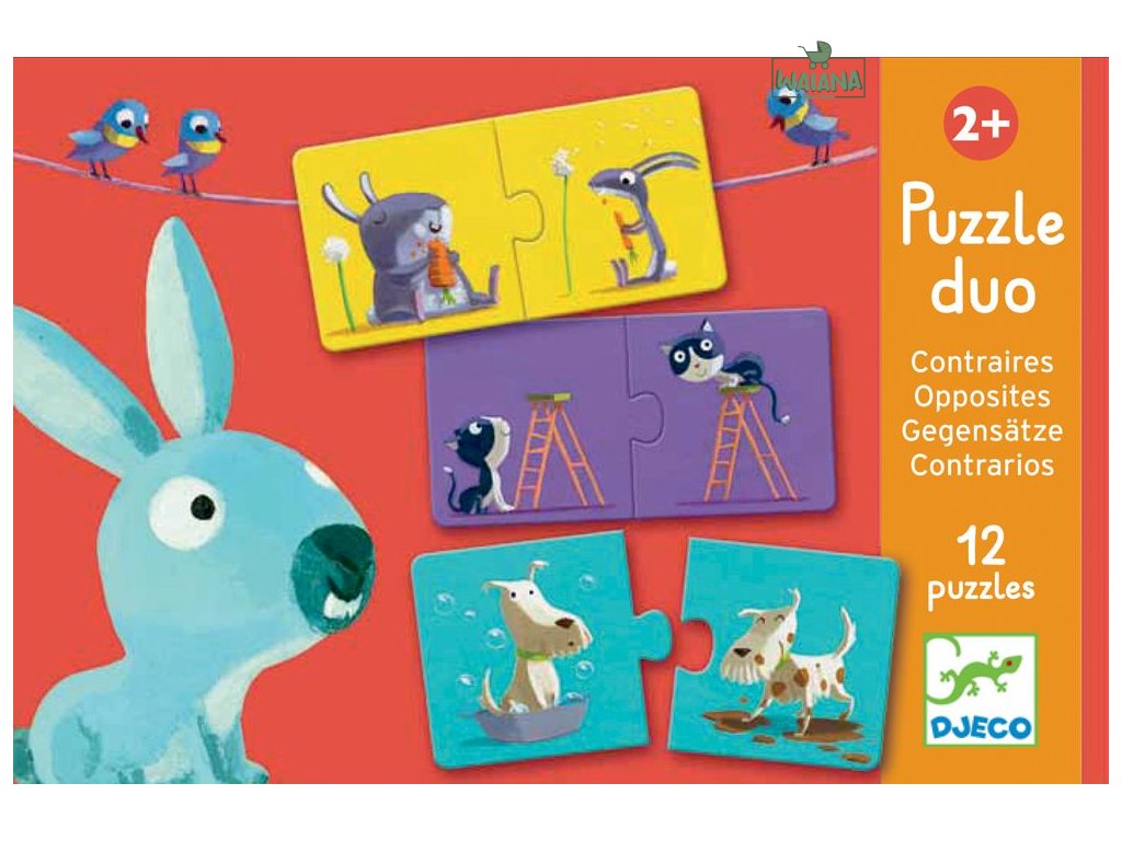 Puzzle duo Protiklady Nauč sa rozoznávať protiklady. Krásne ilustrované puzzle bude deti zoznamovať s protikladmi. Balenie obsahuje 24 dielikov puzzle, z ktorých vytvoríte 12 puzzle obrázkov zobrazujúcich zvieratko v dvoch protichodných situáciách. Dieťa si bude rozširovať slovnú zásobu zatiaľ čo ho budú milé zvieratká zabávať. Nádherne ilustrované dvojdielne puzzle naučí pomenovávať protiklady. Puzzle pre rozvoj kreativity sú obľúbenou zábavou detí, ktorá rozvíja logické myslenie, pamäť a predstavivosť. Zároveň si skladaním precvičujú jemnú motoriku.