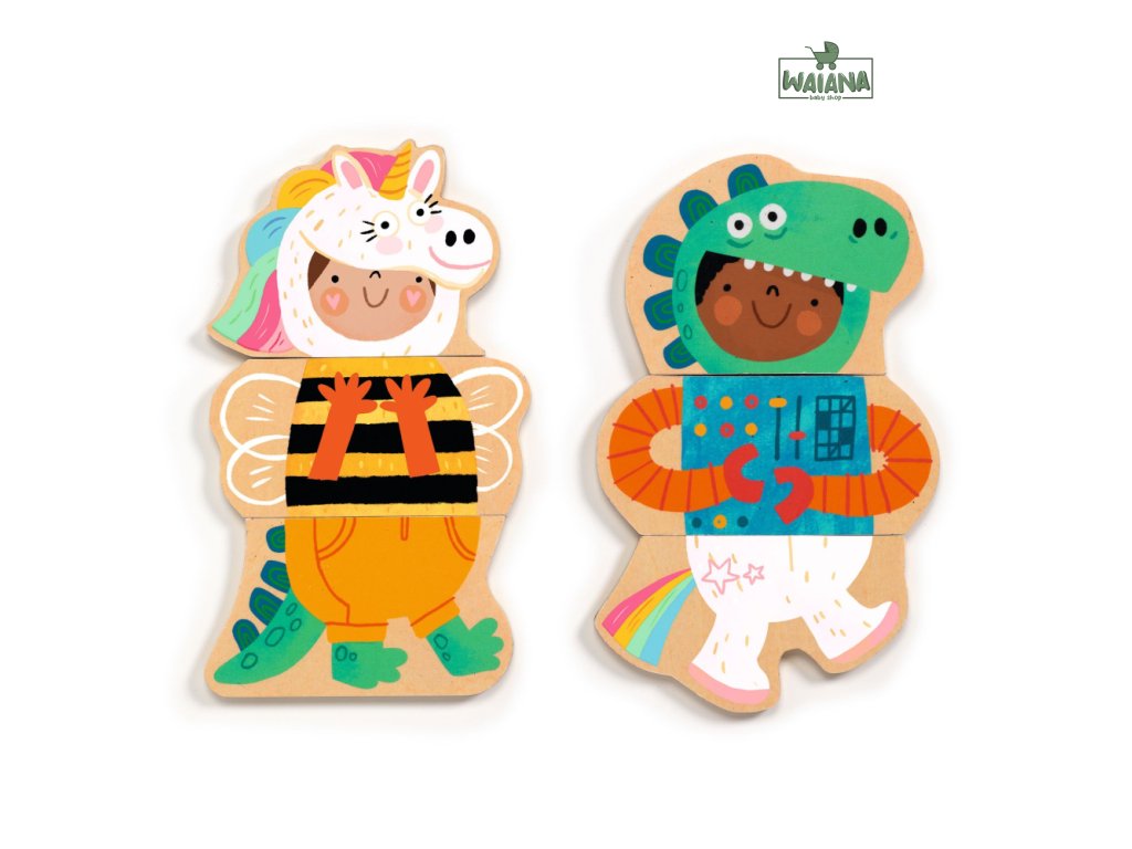 Puzzle magnetky Kostýmy Pomôžte nájsť sove krídla! Sada 24 drevených magnetiek na poskladanie 8 postavičiek veselých detí v kostýmoch. Každá postavička sa skladá z hlavy, trupu a nôh. Postavičky sú veľmi živo ilustrované - vymyslite si o nich kratučké príbehy! Magnetky sú vhodné na magnetickú tabuľu, ale aj na chladničku. Balené sú v peknej pevnej škatuli s magnetickým uzáverom, ktorá poslúži na uskladnenie magnetiek. Drevená edukatívna hračka na princípe voľného kombinovania dielov. Dieťa môže experimentovať s farbami a tvarmi.Obsah: 24 drevených magnetiekOdporúčaný vek: 2+ rokovRozmery balenia: 22 x 19 x 4 cm