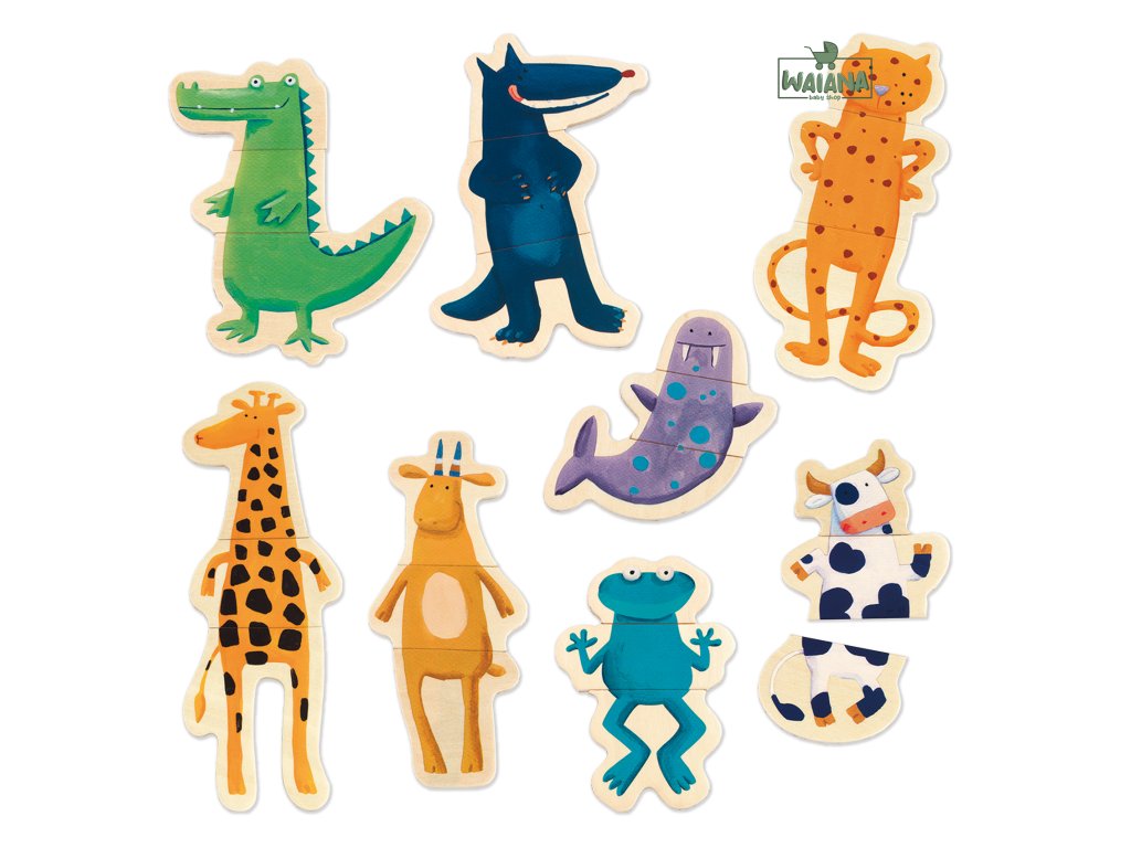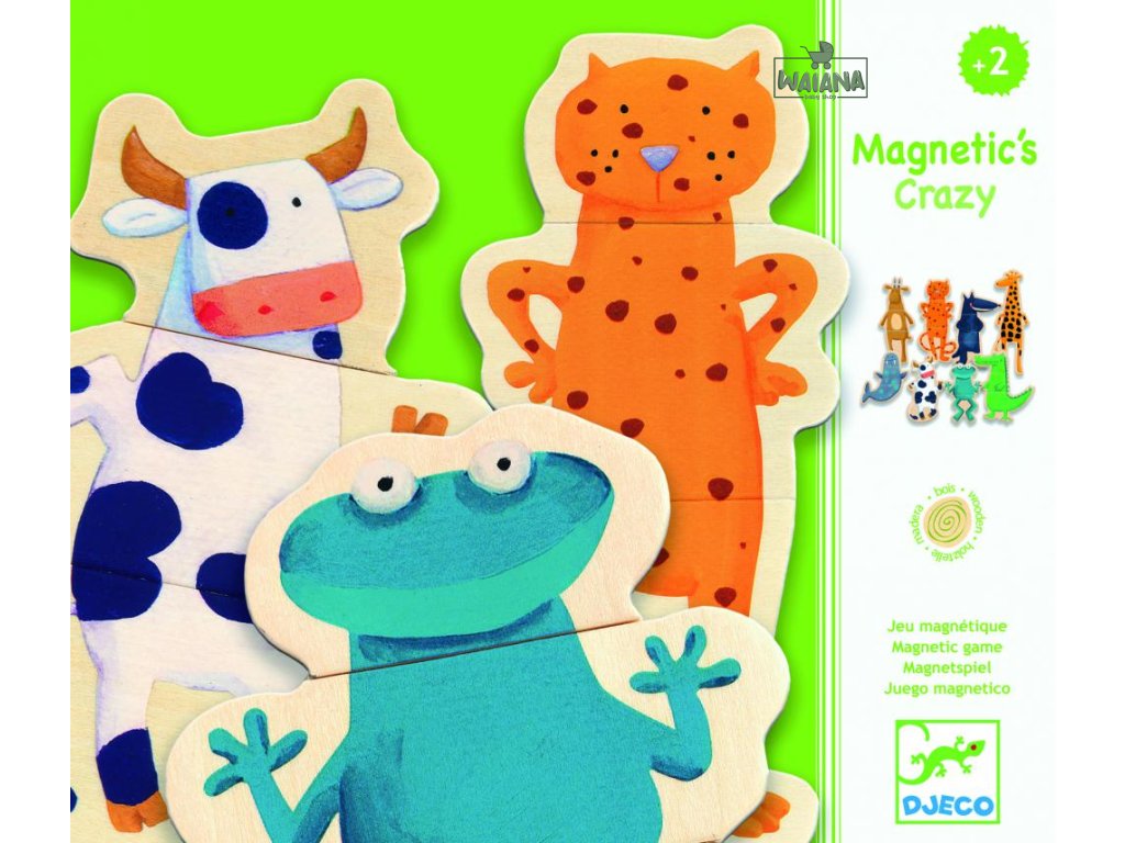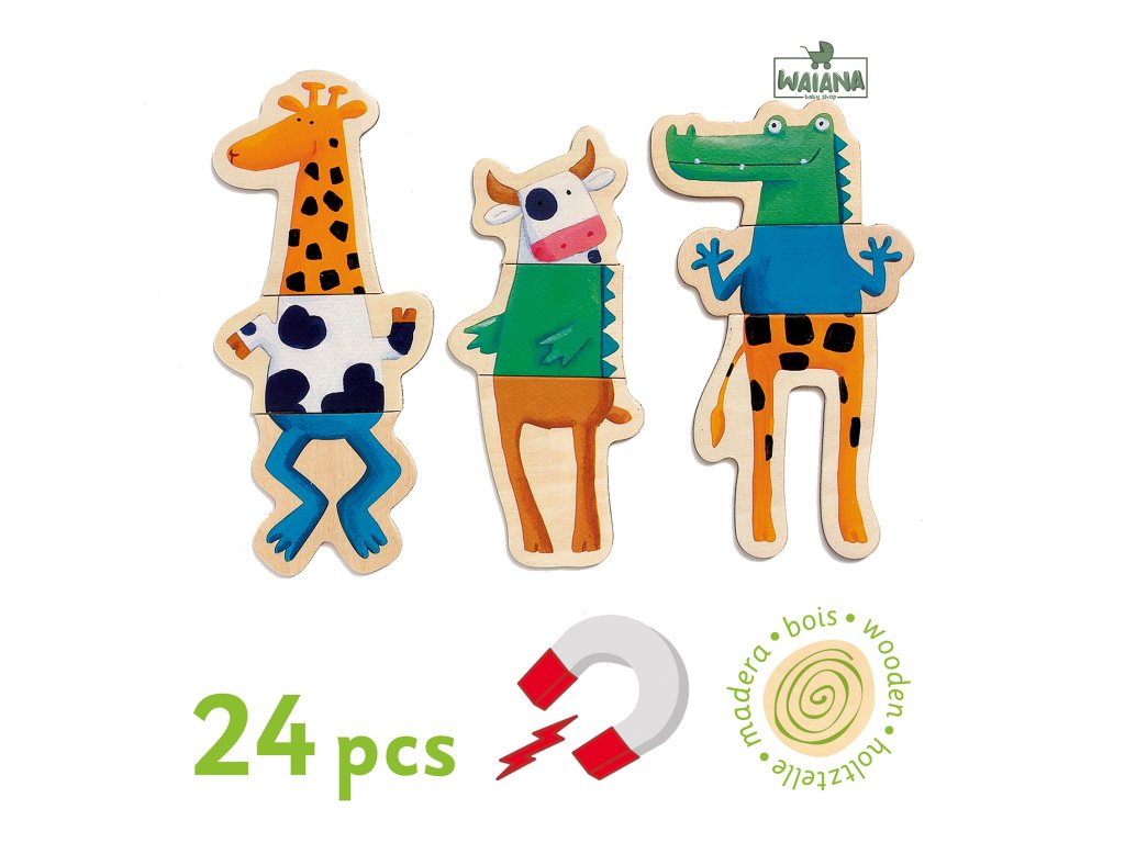 Puzzle magnetky Trojdielne magnetické puzzle. Sada obsahuje 8 drevených magnetických zvieratiek rozdelených na tri kusy: hlava, trup, nohy. Deti si pri skladaní užijú veľa zábavy nakoľko zostavovať môžu zvieratká z rôznych dielikov podľa vlastnej predstavivosti a zostaviť tak nového tvora. Vytvárajte vlastné bláznivé kombinácie. Set obsahuje celkom 24 drevených puzzle dielikov. Nájdete tu kravu, mroža, žabu, leoparda, vlka, žirafu, krokodíla a jeleňa. Zvieratká je možné umiestniť napr. na chladničku. Magnetky rozvíjajú predstavivosť, jemnú motoriku a koordináciu oko – ruka. Materiál: drevo