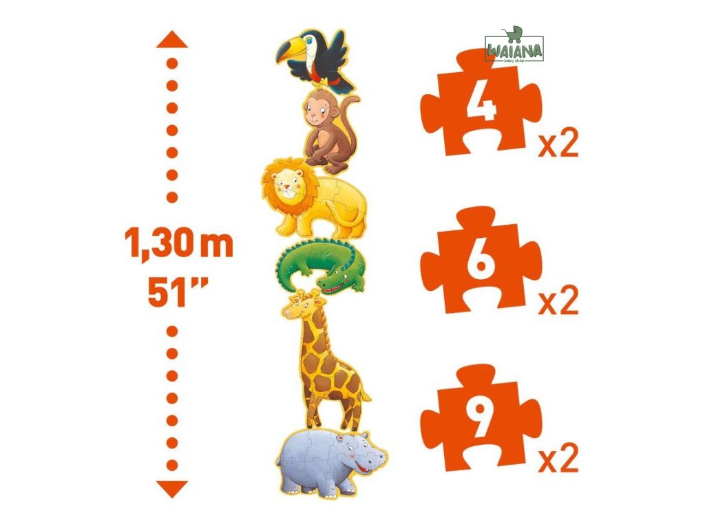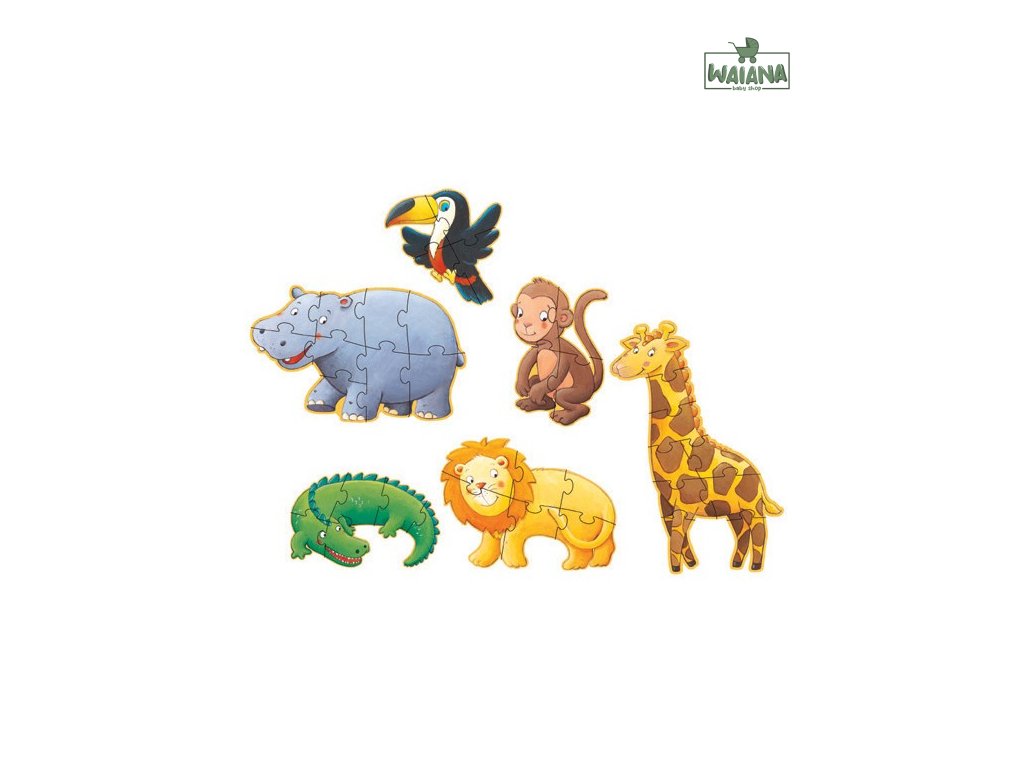 Puzzle so zvieratkami pre všetkých milovníkov safari. Nádherné progresívne puzzle s milými zvieratkami, aj pre malé deti, nakoľko pozostávajú z dostatočne veľkých dielikov.Rozvíja logické myslenie a jemnú motoriku. Puzzle, ktoré rozvíja u detí jemnú motoriku, zručnosť, logické myslenie, predstavivosť a je vhodné aj na pomenovávanie zvieratiek. Jednotlivé zvieratká sa skladajú z 4, 6, 9 dielikov. Deti môžu na začiatok skladať obrázok s menším počtom dielikov, kým postupne prejdú na väčší obrázok. Rozmer balenia: 33 x 25,5 x 6 cm.