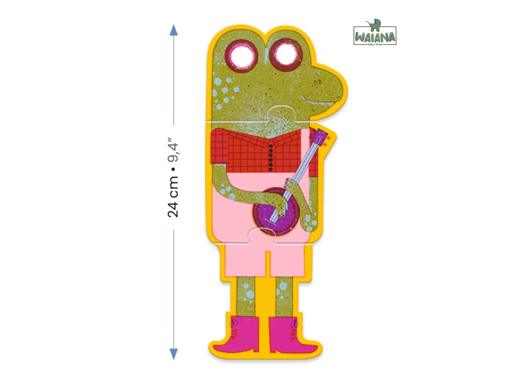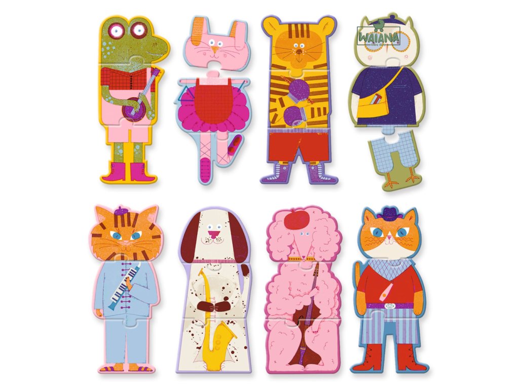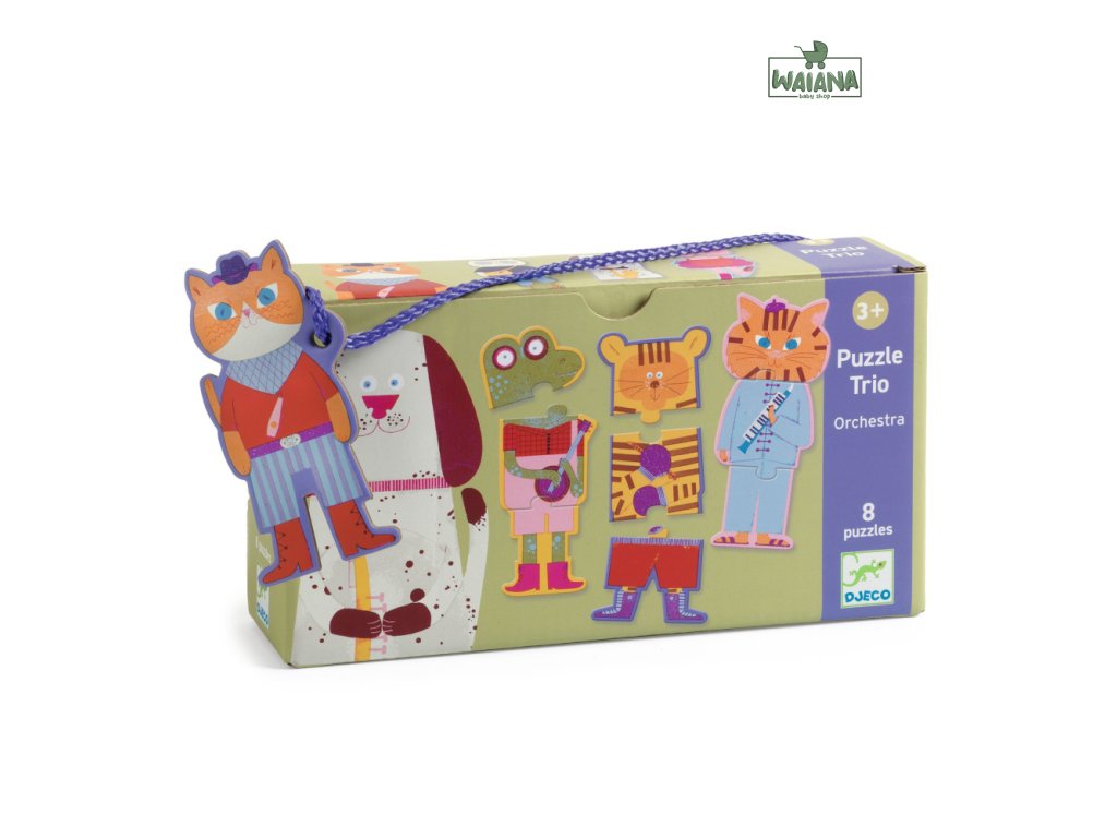 Puzzle Trio Orchester 8 ks Hudobné zvieratká v skladačke pre najmenších! Puzzle Trio Orchester je ideálne vzdelávacie puzzle pre deti od 3 rokov, ktoré spája zábavu s učením. V tejto originálnej verzii deti skladajú zvieratká – hudobníkov, a to vo vertikálnom poradí. Každé zviera je rozdelené na 3 dieliky, ktoré musia správne spojiť, aby vznikol celý člen orchestera. Puzzle podporuje rozvoj pozorovacích schopností, logického myslenia a jemnej motoriky. Navyše vďaka samoopravnému systému si deti samy overia, či dieliky sedia. Vyrobené z hrubého kartónu FSC®, ktorý je odolný a vhodný pre malé detské ručičky.