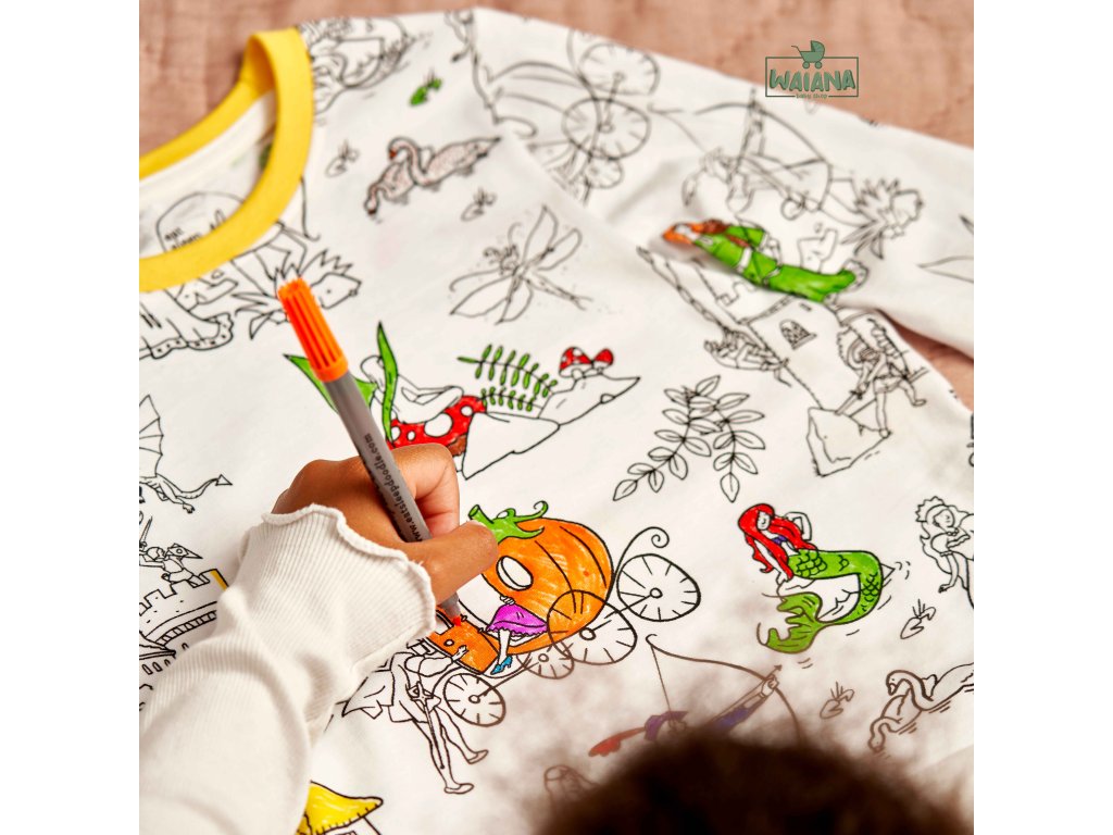 Pyžamo na vyfarbenie Fairytales & legends Vymaľuj a oper 6-7 rokovVyfarbi si svoje pyžamoVstúpte do sveta rozprávok s originálnym pyžamom Fairytales & Legends, ktoré si vaše dieťa môže vyfarbiť podľa vlastnej fantázie! Na tomto mäkučkom pyžamku ožívajú obľúbené postavičky – princezné, draci, víly, jednorožce a ďalšie legendárne bytosti.Stačí použiť priložené umývateľné fixky, a keď je dielo hotové, pyžamo jednoducho vložiť do práčky – farby zmiznú a malý umelec môže začať tvoriť nanovo. Pyžamo sa dodáva v praktickom bavlnenom vrecku, ideálnom na cesty, prespávačky či pyžamové párty.Prečo si deti (a rodičia) zamilujú toto pyžamo?Kombinuje kreatívnu hru a pohodlie v jednomObsahuje umývateľné fixky – farby možno po praní znova použiťRozprávkové motívy: princezné, draci, víly, jednorožceVyrobené z mäkkej bavlnySkvelý darček na Vianoce, narodeniny alebo pyžamovú párty