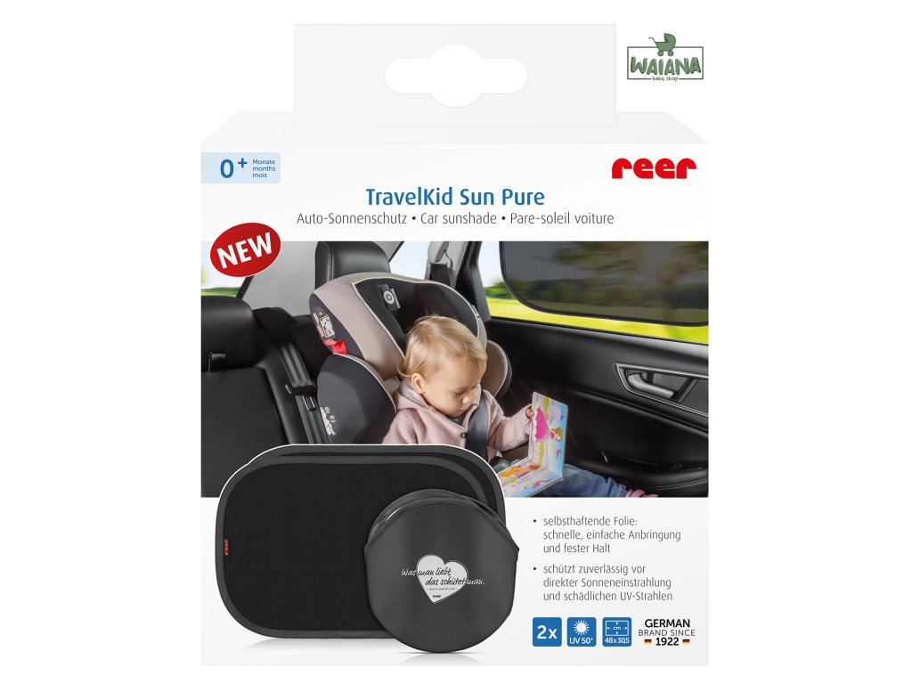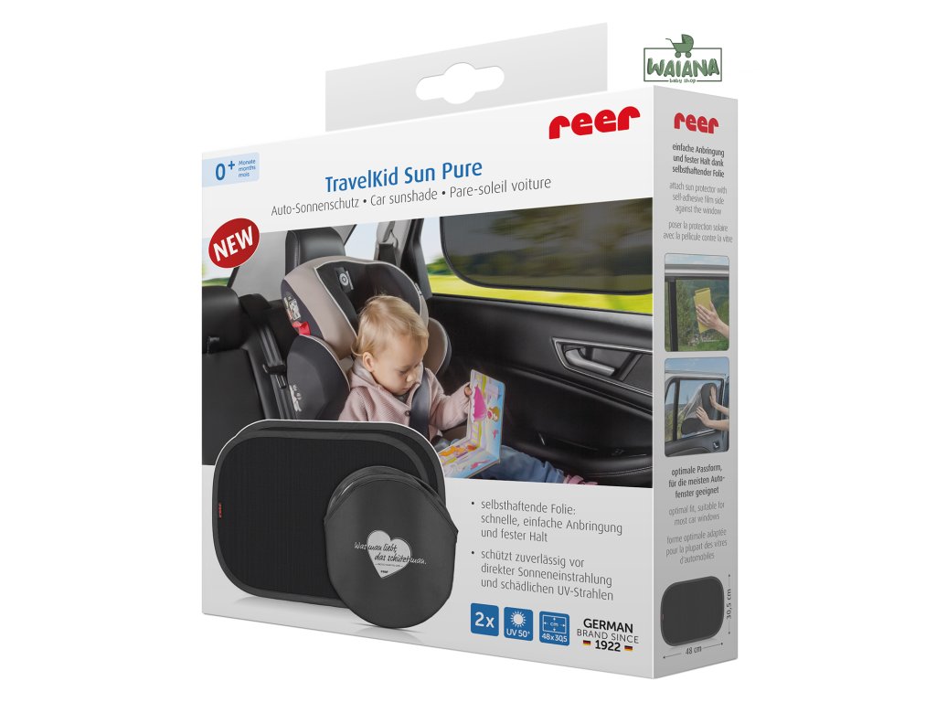 TravelKid Sun Pure poskytuje vašemu dítěti v autě příjemný stín a zabraňuje zahřívání vnitřku automobilu. Vysoce kvalitní látka má sluneční ochranný faktor 50+ a nabízí tak plnou ochranu před pronikajícími slunečními paprsky. Kromě obecné ochrany před slunečním zářením také odvádí nebezpečné UV záření a chrání tak vaše dítě před spálením.