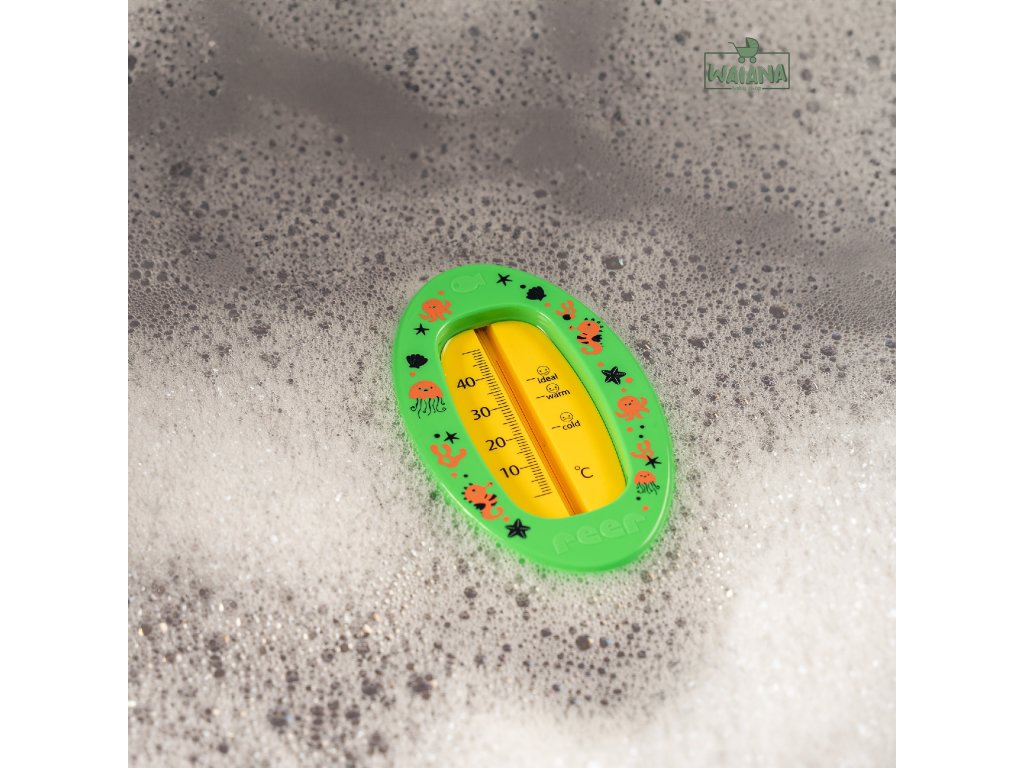 Teploměr má přehlednou stupnici, díky které lze okamžitě vyčíst teplotu vody. Pro ještě snadnější kontrolu jsou na stupnici vyznačeny symboly/emotikony, které ukazují, zda je voda příliš studená, horká, nebo má optimální teplotu. Rodiče tak mají jistotu na první pohled.