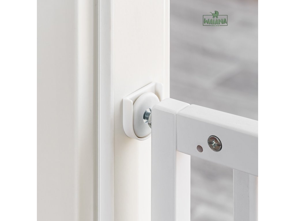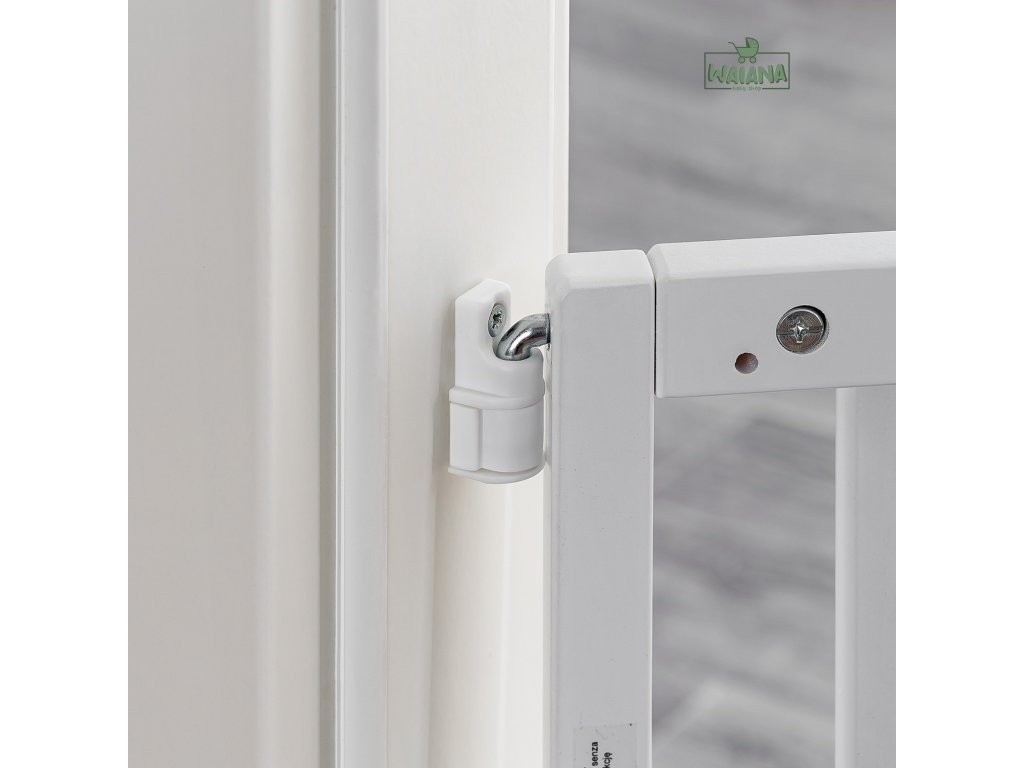 Aby vaše děti nemohly odemknout zamčenou zábranu, byla vybavena systémem aktivního zámku – dvojitým mechanismem otevírání. Jinými slovy, k odblokování bezpečnostní zábrany je třeba provést dvě akce současně. Dospělí jej však mohou rychle otevřít jednou rukou. Jednoduše stiskněte tlačítka na boku a zvedněte kliku nahoru, abyste zábranu odemkli.