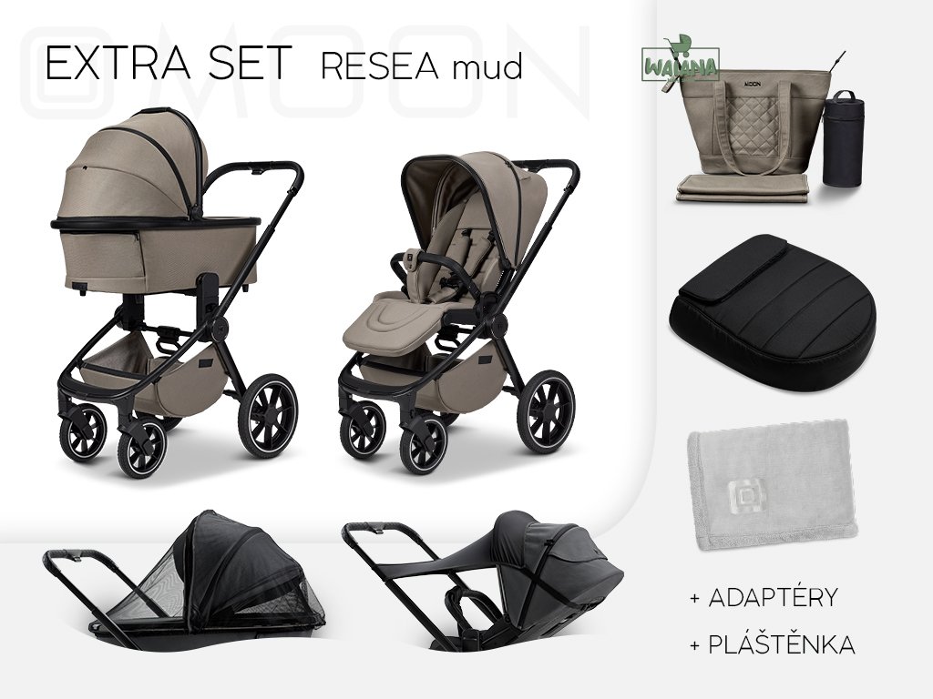 Výhodná sada RESEA+ EXTRA obsahuje nánožník black na sportovní verzi, přebalovací tašku v barvě kočárku, moskytiéru, sluneční clonu, luxusní teplou deku MOON, pláštěnku a adaptéry na autosedačku. Barva zobrazeného produktu se může lišit od originálu.