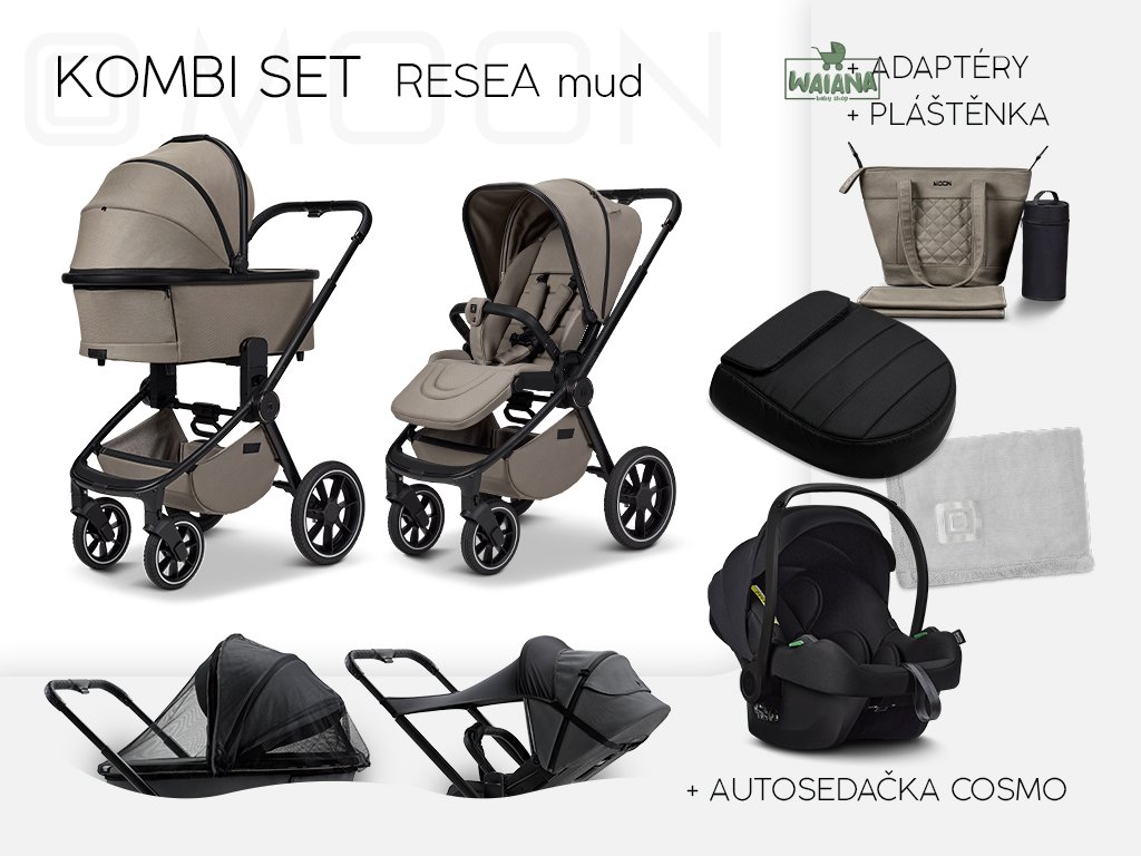Výhodná sada RESEA+ KOMBI obsahuje nánožník black na sportovní verzi, přebalovací tašku v barvě kočárku, moskytiéru, sluneční clonu, luxusní teplou deku MOON, autosedačku COSMO Black, pláštěnku a adaptéry na autosedačku. Barva zobrazeného produktu se může lišit od originálu.
