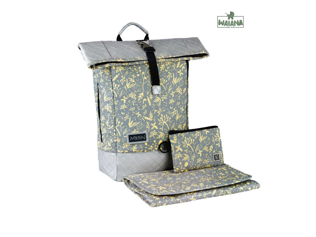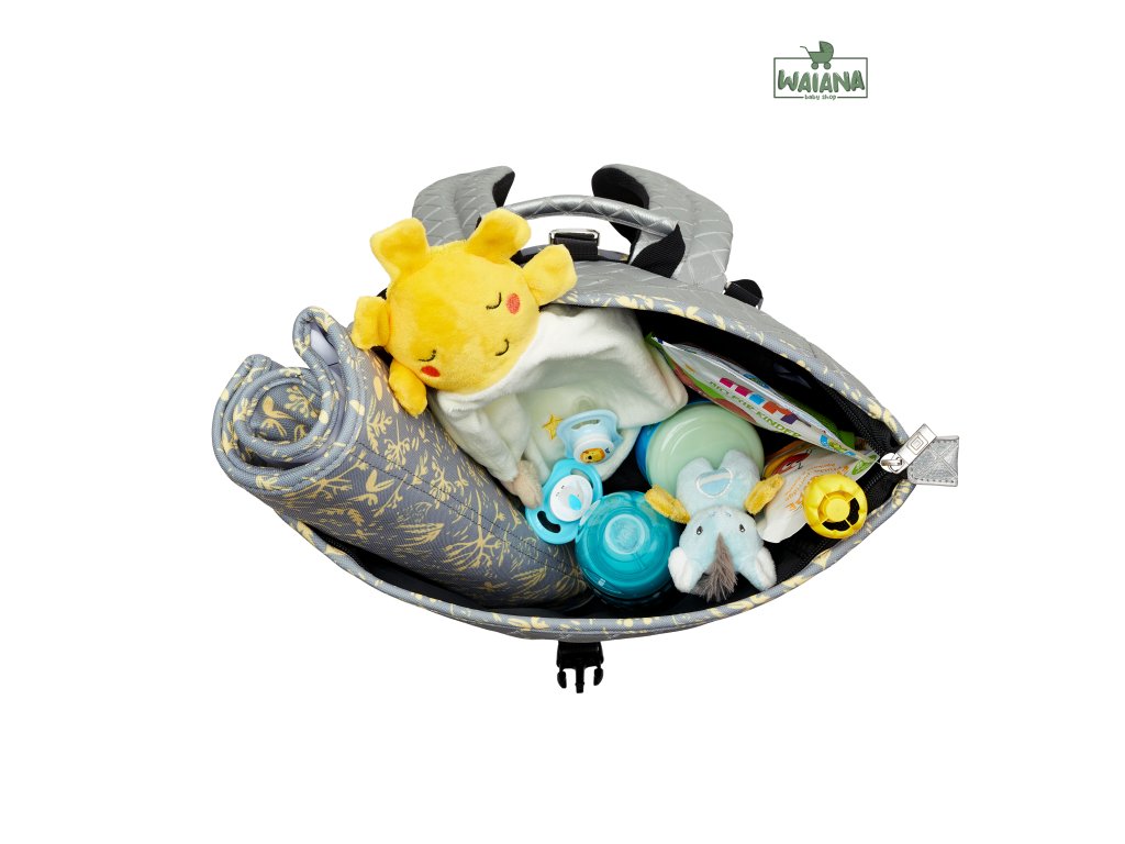 Obsahuje přebalovací podložku, termoobal na láhev, kapsičku na mobilní telefon a poutka na zavěšení na rukojeť kočárku.