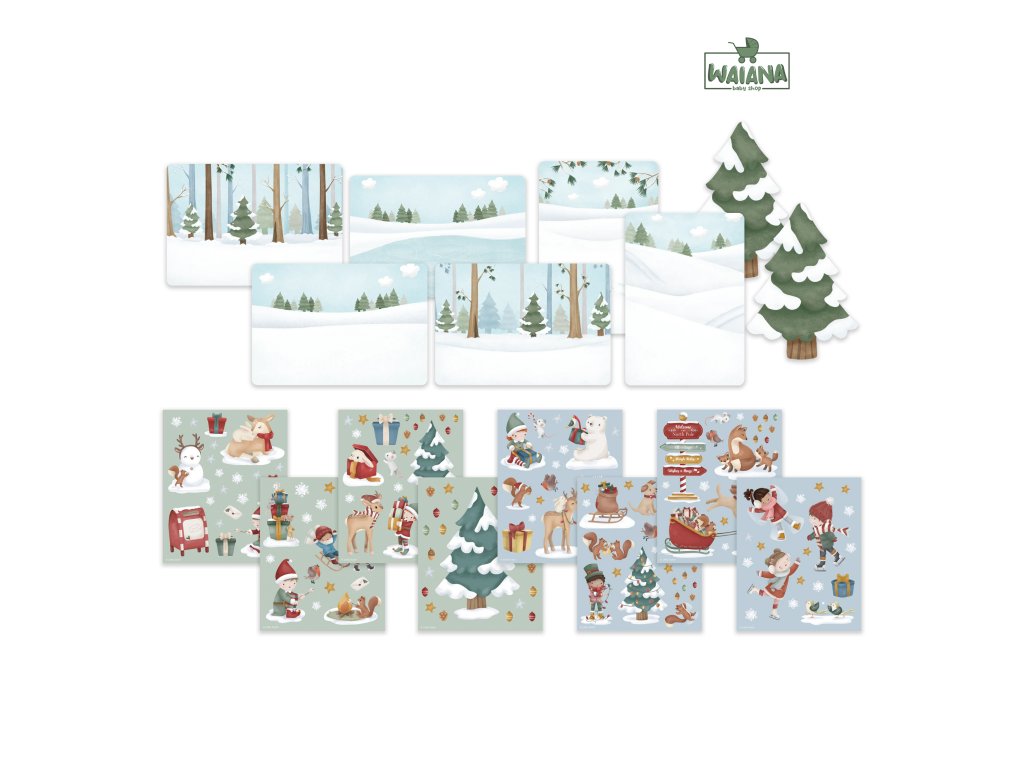 Obsah balenia: viac ako 150 farebných vianočných samolepiek, 8 pohľadníc k vlastnému zdobeniu