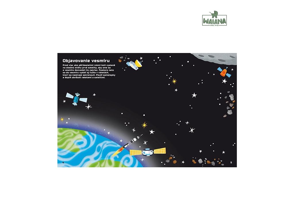 Samolepková knižka Vesmír je fascinujúcou pomôckou pre malých prieskumníkov, ktorí túžia spoznávať planéty, hviezdy, rakety aj kozmonautov. Na 16 farebných stranách deti objavia tajomstvá slnečnej sústavy, uvidia pristátie na Mesiaci aj pohľad na Zem z vesmíru. Súčasťou je 8 strán samolepiek, ktoré deti dolepujú podľa deja alebo vlastnej fantázie – a tak si vesmír doslova vytvoria samy.