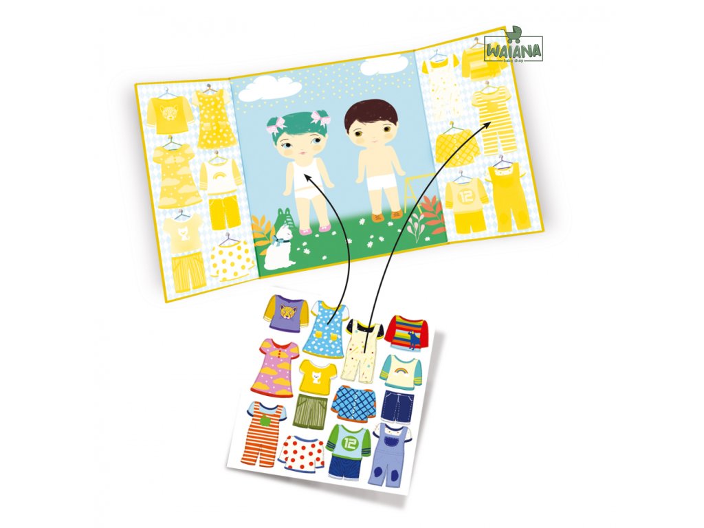 Samolepky Obliekanie Set so znovupoužiteľnými samolepkami. Znovuodlepiteľné samolepky a podložka s obrázkom obliekajúcich sa detí. Bábiky čakajú, aké oblečenie im vyberieš. Hraj sa s obrázkami, stále znovu! Na podložku- deti nalepujú oblečenie a obliekajú ich! Podložka má na bokoch zatvárateľné strany, kde je miesto na odloženie samolepiek. Samolepky sú znovuodlepiteľné a môžeš ich pohodlne prelepovať. Zatvárateľná podložka je veľmi praktický formát na hranie a zároveň uschovanie samolepiek. Malý kreatívny darček pre drobcov. Obsah: podložka na lepenie, hárok vinylových samolepiek. Odporúčaný vek: 18+ mesiacov. Rozmery: 43 x 23 cm.
