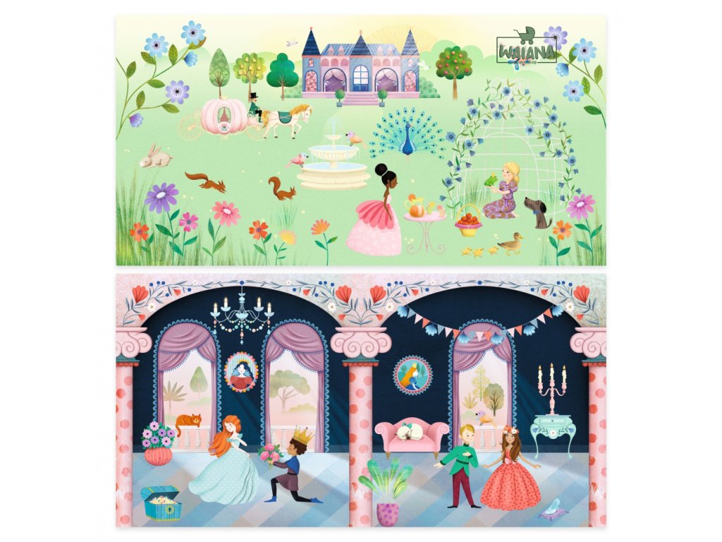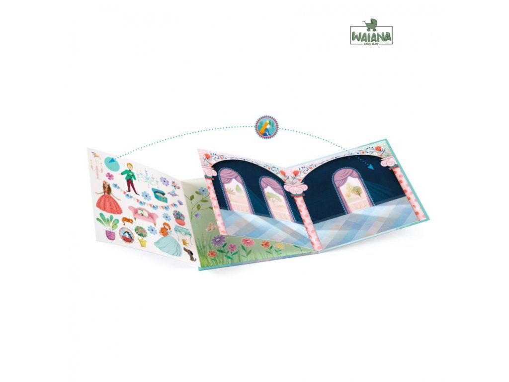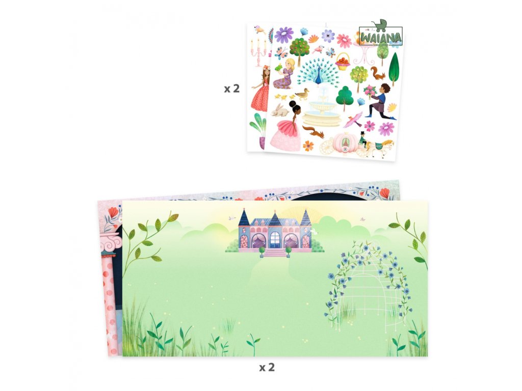 Set s veľkým množstvom odnímateľných samolepiek. Tvrdá mapka s dvoma scénami a viac než 50 odnímateľnými samolepkami. Princezné a princovia čakajú, aký príbeh im vytvoríš. Samolepky sú prehľadne umiestnené na hárkoch na okrajoch mapky. Dieťa môže dopĺňať scény zámockej záhrady a tanečnej sály v rôznych variáciách. Ideálny formát na cestovanie.Rozmery scenérií: 44 x 22 cmRozmery mapky: 22 x 23 x 1 cm
