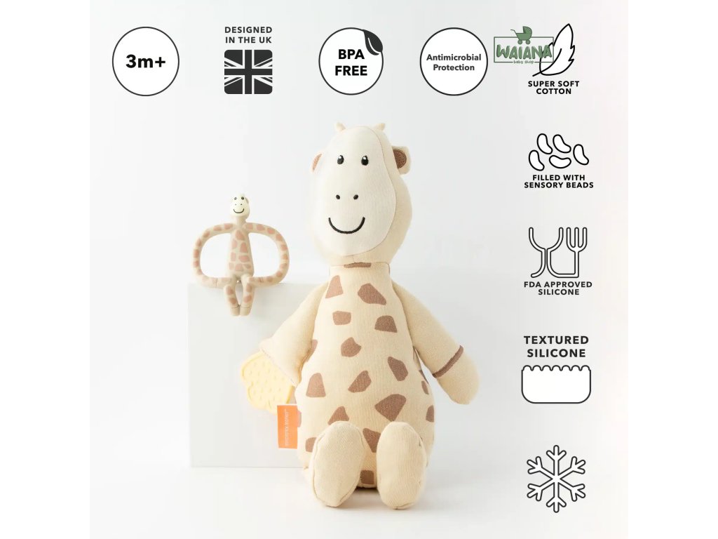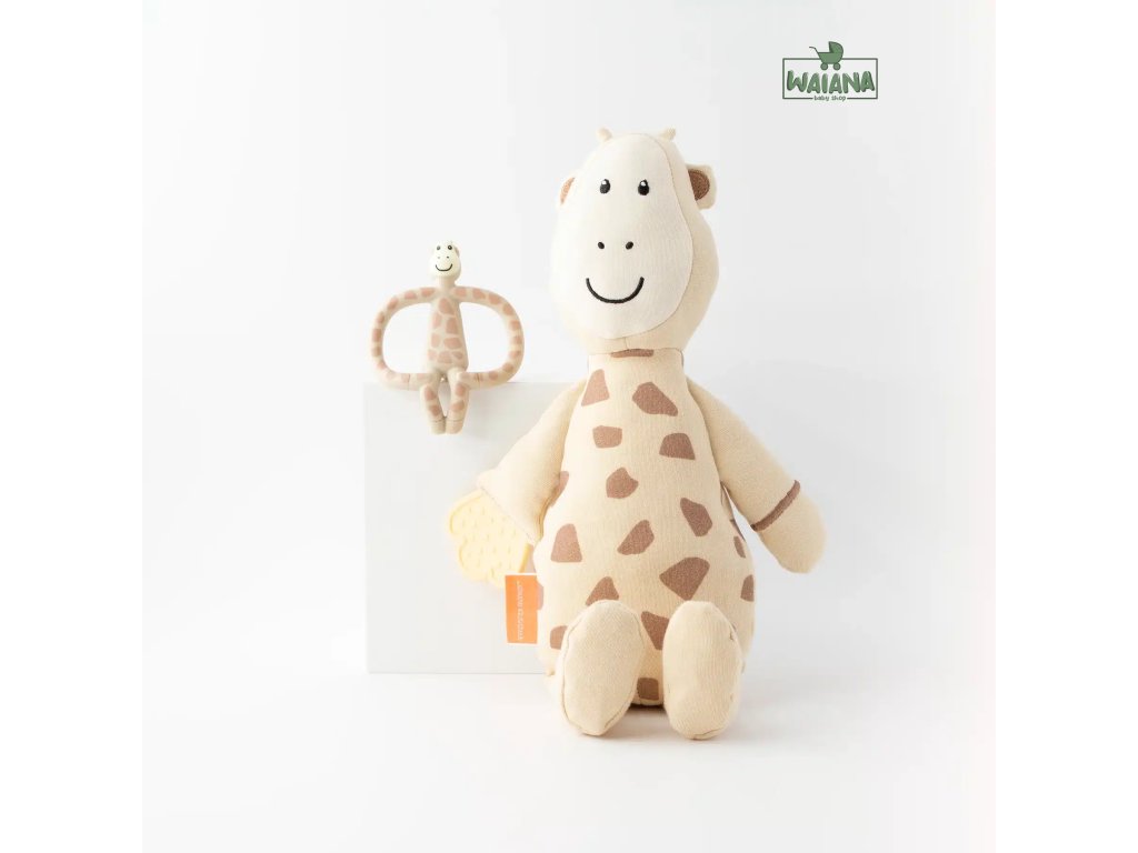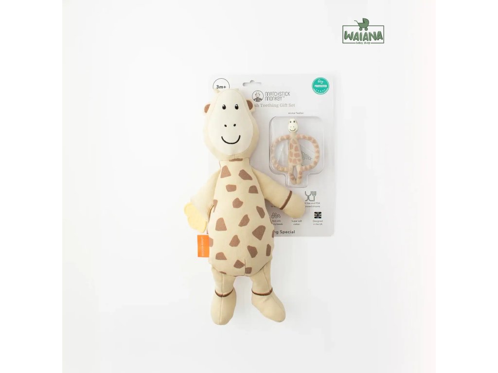Darujte novým rodičom obľúbené hryzadlo MATCHSTICK MONKEY v tvare žirafky spolu s mäkkou plyšovou žirafkou v rovnakom dizajne.