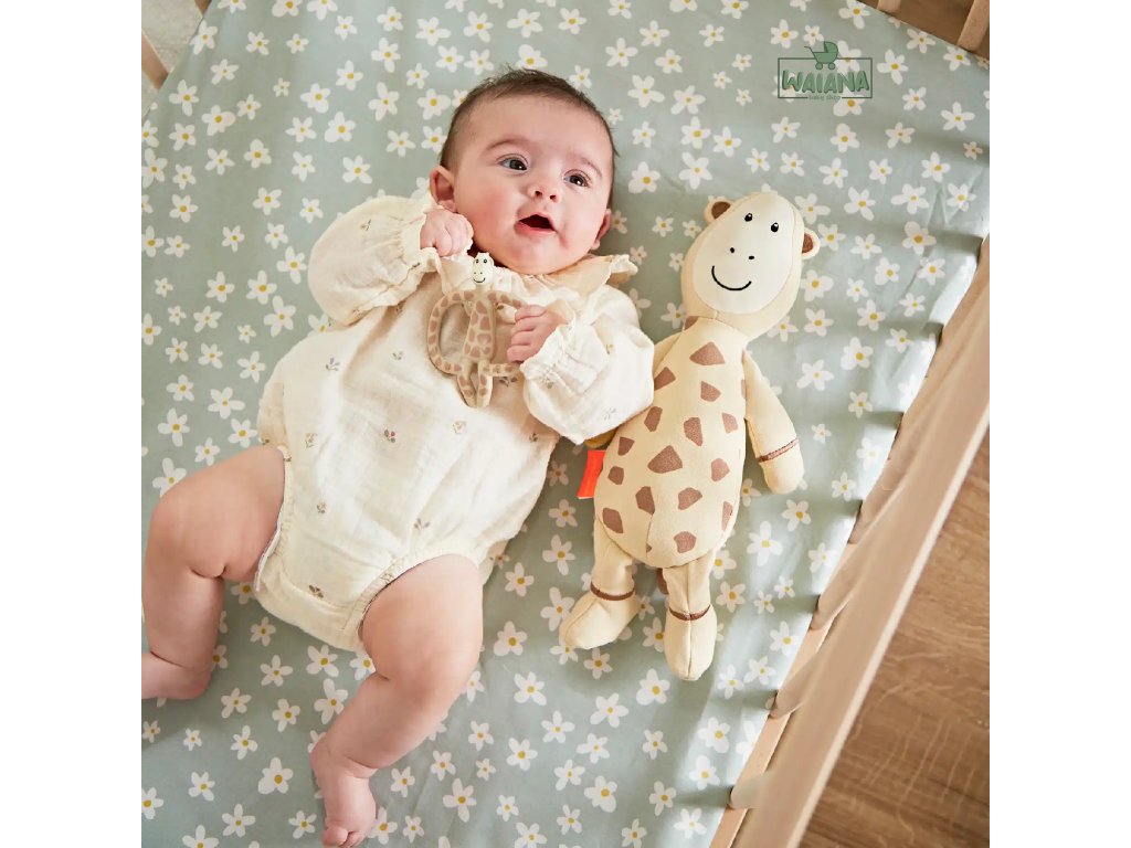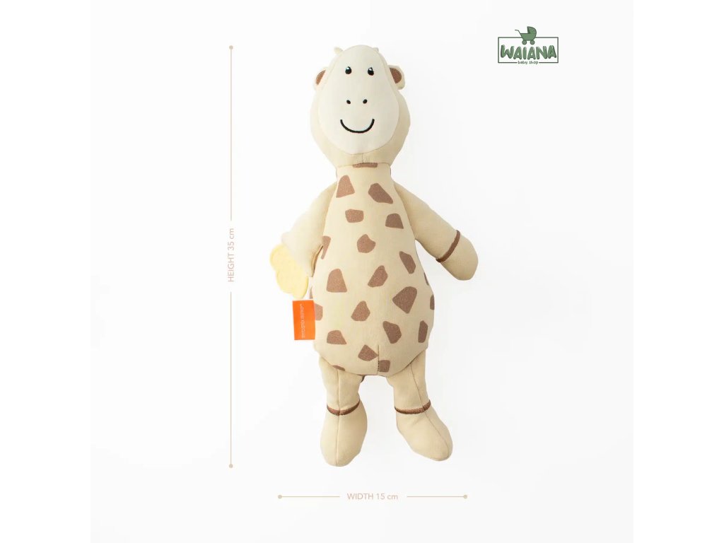 Mäkká bavlnená plyšová žirafka je šetrná k detskej pokožke a vo vnútri má senzorické guličky, ktoré stimulujú zmysly. Obsahuje hryzadlovú ruku na masáž ďasien a šuštiace nožičky pre sluchovú a hmatovú stimuláciu – ideálny kamarát na upokojenie. Pre jednoduchú údržbu je možné ju prať v práčke.