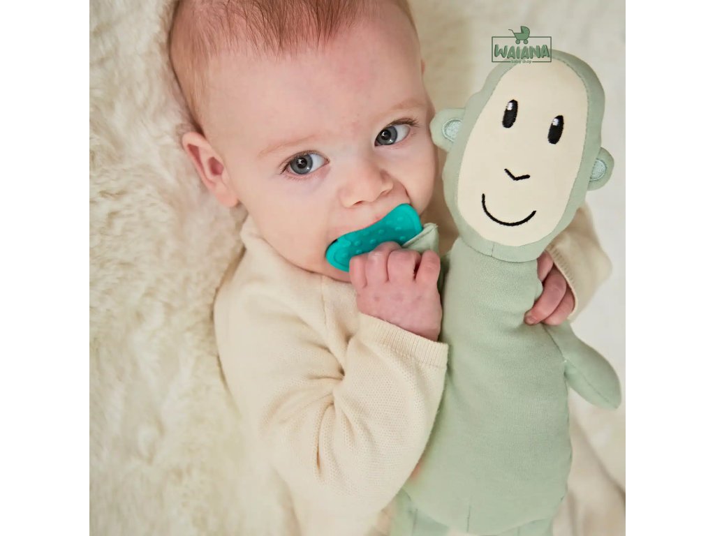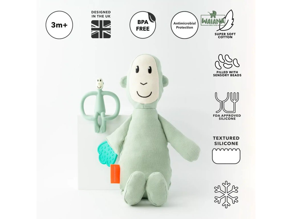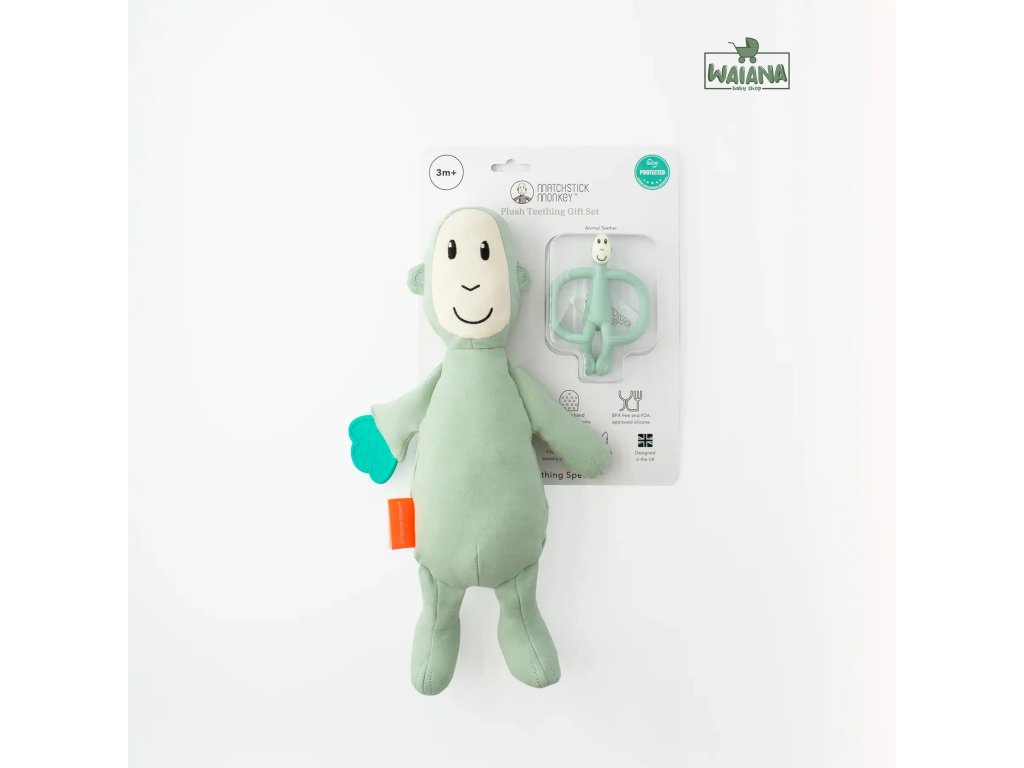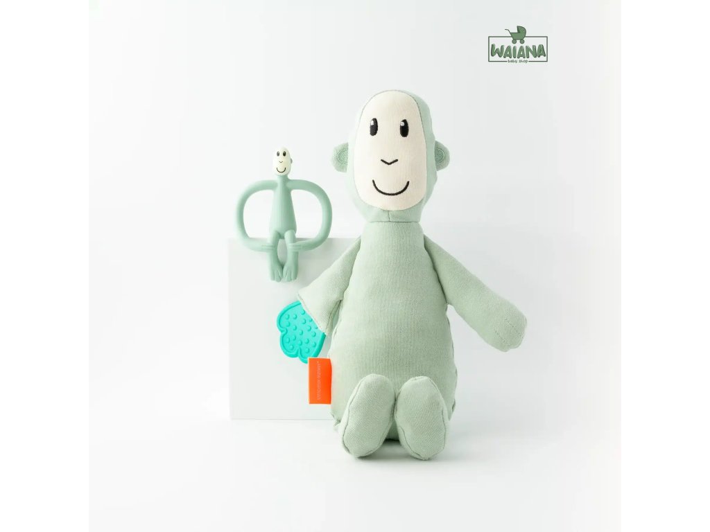 Darujte novým rodičom obľúbené hryzadlo MATCHSTICK MONKEY v tvare opičky spolu s mäkkou plyšovou opičkou v rovnakom dizajne.