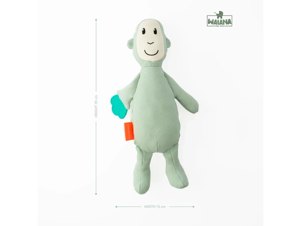 Mäkká bavlnená plyšová opička je šetrná k detskej pokožke a vo vnútri má senzorické guličky, ktoré stimulujú zmysly. Obsahuje hryzadlovú ruku na masáž ďasien a šuštiace nožičky pre sluchovú a hmatovú stimuláciu – ideálny kamarát na upokojenie. Pre jednoduchú údržbu je možné ju prať v práčke.