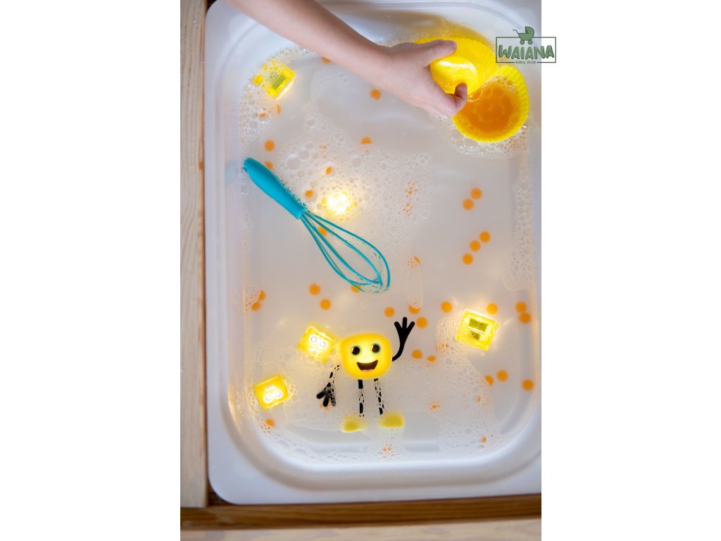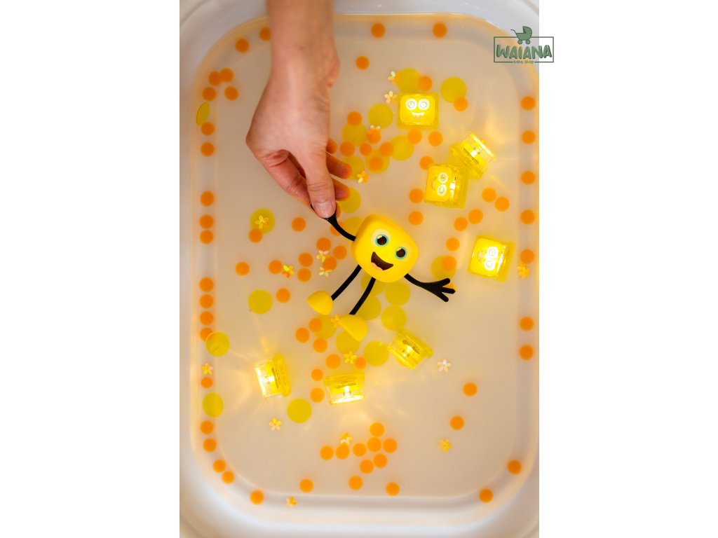 Senzorické svietiace kocky do vody AlexZábavné kúpanie plné farieb so zmyslovými kockami Glo PalsObjavte kúzlo svetiel a zábavy s Glo Pals Senzorické svietiace kocky do vody Alex! Tieto jedinečné svietiace kocky sú navrhnuté tak, aby premenili každé kúpanie na dobrodružstvo plné svetiel a smiechu. Stačí ich ponoriť do vody a sledujte, ako sa rozžiaria žltým svetlom, ktoré odráža farbu postavičky Alex.Prečo si vybrať Glo Pals senzorické kocky?Zábava a učenie v jednom: Kocky podporujú rozvoj senzorických schopností, jemnej motoriky a rozpoznávania fariebBezpečnosť na prvom mieste: Batérie sú hermeticky uzavreté ultrazvukovým zvarom, čo eliminuje riziko ich otvorenia alebo prehltnutiaDlhá životnosť: Každá kocka svieti približne 12–16 hodín aktívneho používania, čo zodpovedá 20–30 kúpeľomEkologický prístup: Vyrobené z recyklovaných materiálov a balené v papierových obaloch šetrných k prírodeViac než len hračka do vaneFarebná terapia: Rôzne farby svetla môžu ovplyvniť náladu dieťaťa – modrá upokojuje, žltá povzbudzuje a zelená prináša pocit pokojaKreatívne aktivity: Vytvorte svietiace fľaše s vodou, flitrami a trblietkami pre vizuálnu stimuláciuHra na suchu: Aj po vybití batérií môžu kocky slúžiť na triedenie farieb, stavanie veží alebo ako náklad pre hračkárske autíčkaPár praktických informáciíPo každom použití: Vyberte kocky z vody, opláchnite ich, odkvapkajte prebytočnú vodu a nechajte vyschnúť na vzduchuČistenie senzorov: Ak svetlo slabne, jemne očistite kovové senzory mäkkou handričkou alebo vatovým tampónomŽiadny olej do kúpela: Vysoký obsah oleja môže potiahnuť senzory a zabrániť im v detekcii kontaktu s vodouSkladovanie: Uchovávajte na suchom a vetranom mieste, aby ste predĺžili ich životnosťIdeálny darček pre deti od 3 rokovGlo Pals Senzorické svietiace kocky do vody Alex sú perfektným darčekom pre deti, ktoré milujú kúpanie, svetielka a dobrodružstvá. Prineste domov túto zábavnú a vzdelávaciu hračku, ktorá rozžiari nielen vašu kúpeľňu, ale aj detské oči!