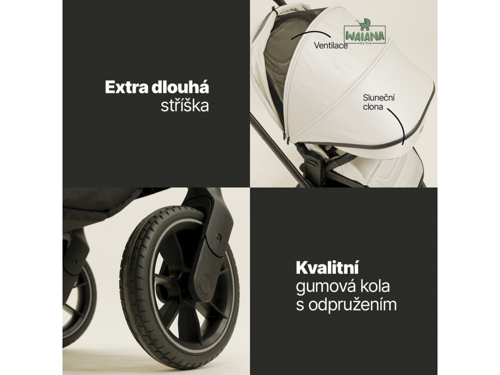 Veľké gumové kolesá s odpružením, predné s automatickou aretáciou, zvládnu hladko nielen mestský povrch, ale aj nerovnosti v prírode. Vďaka skvelému odpruženiu bude jazda vždy plynulá a príjemná.