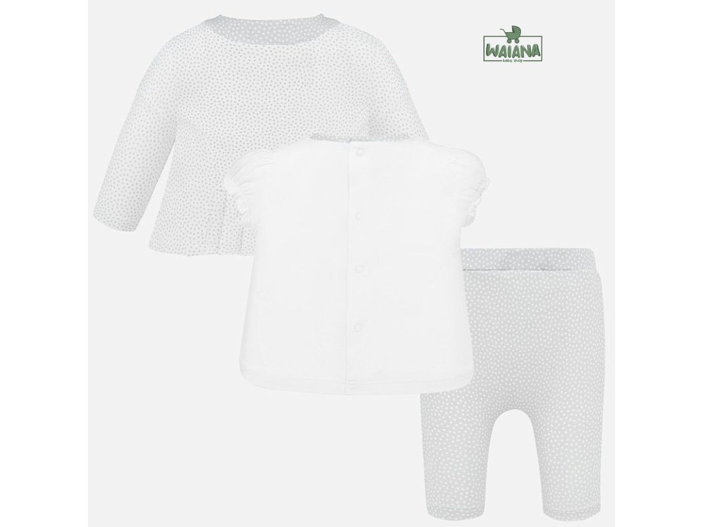 Krásný setík pro maléhou parádnici od kvalitní španělské značky MAYORAL. Originální bílé tričko s medvídkem + šedé tepláčky a krásná šedá mikinka na zapnutí.