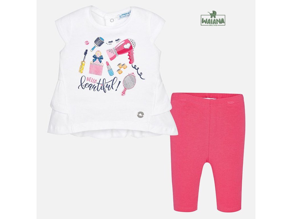 Krásný setík pro malou parádnici od kvalitní španělské značky MAYORAL. Originální bílé tričko se všemi pomůckami pro krásu malé parádnice + malinové leginy. Tričko ozdobené na zadní straně kanýrkem.