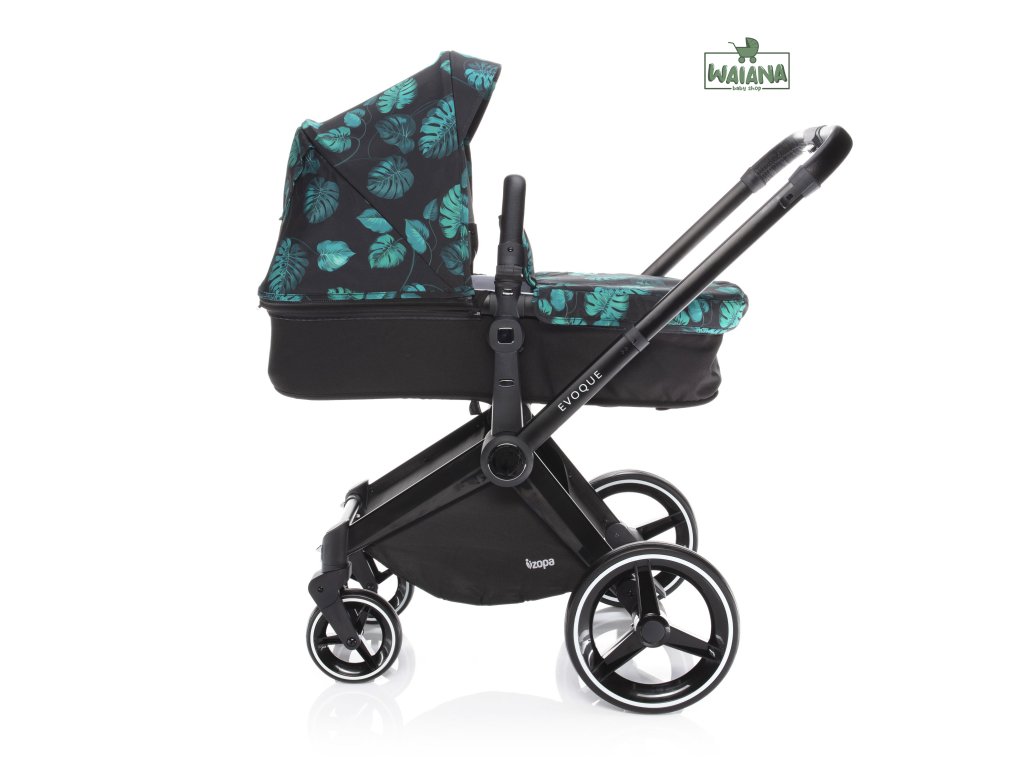 Kočík Zopa Evoque je dizajnový ale zároveň praktický kočík pre deti od narodenia do 15 kilogramov. Ide o dvojkombináciu, kedy sa z rámu priestranné, hlbokej korby vytvorí športové sedenie. Športová sedačka je polohovateľná a možno umiestni po i proti smeru jazdy. Dieťa chráni päťbodový bezpečnostný pás.