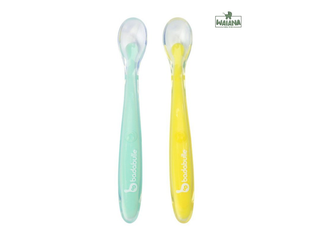 Jedálenské lyžičky s mäkkými silikónovými zakončeniami, ktoré sú šetrné k citlivým detským ďasnám.