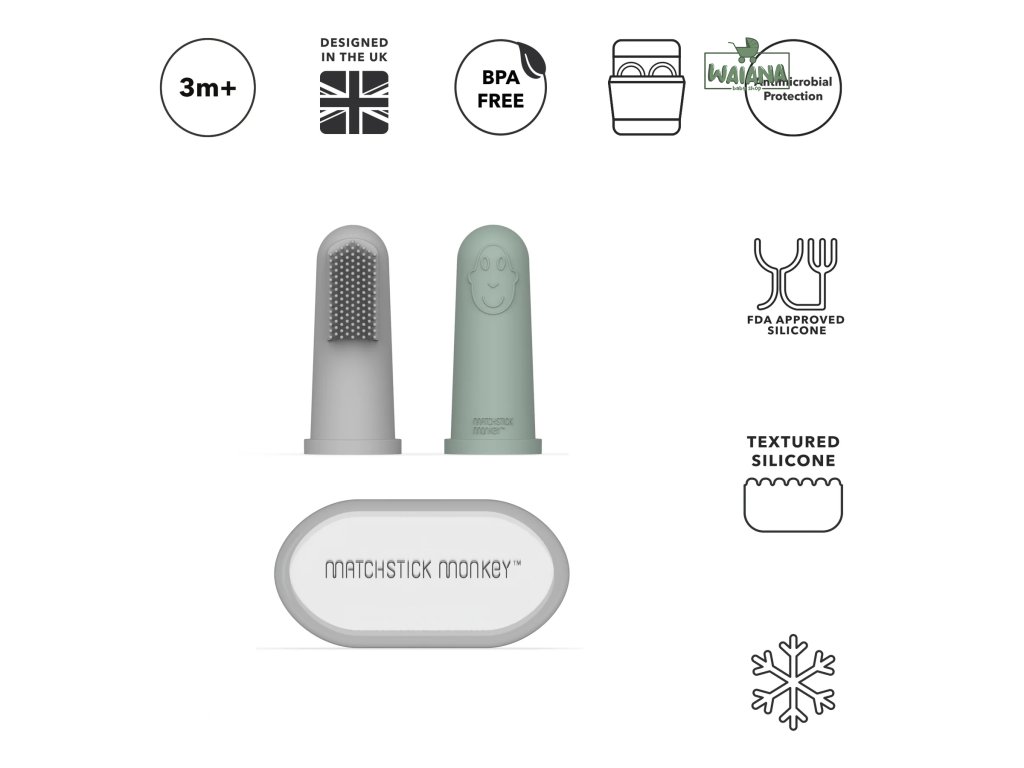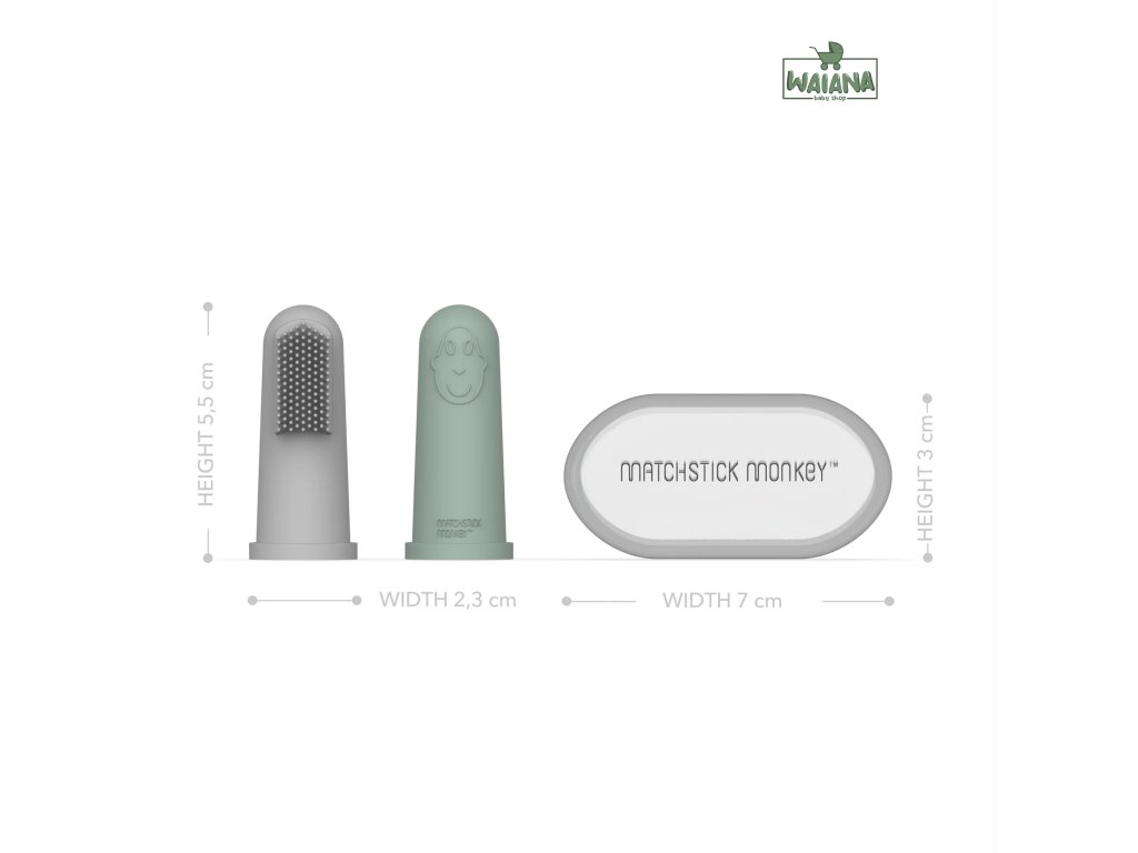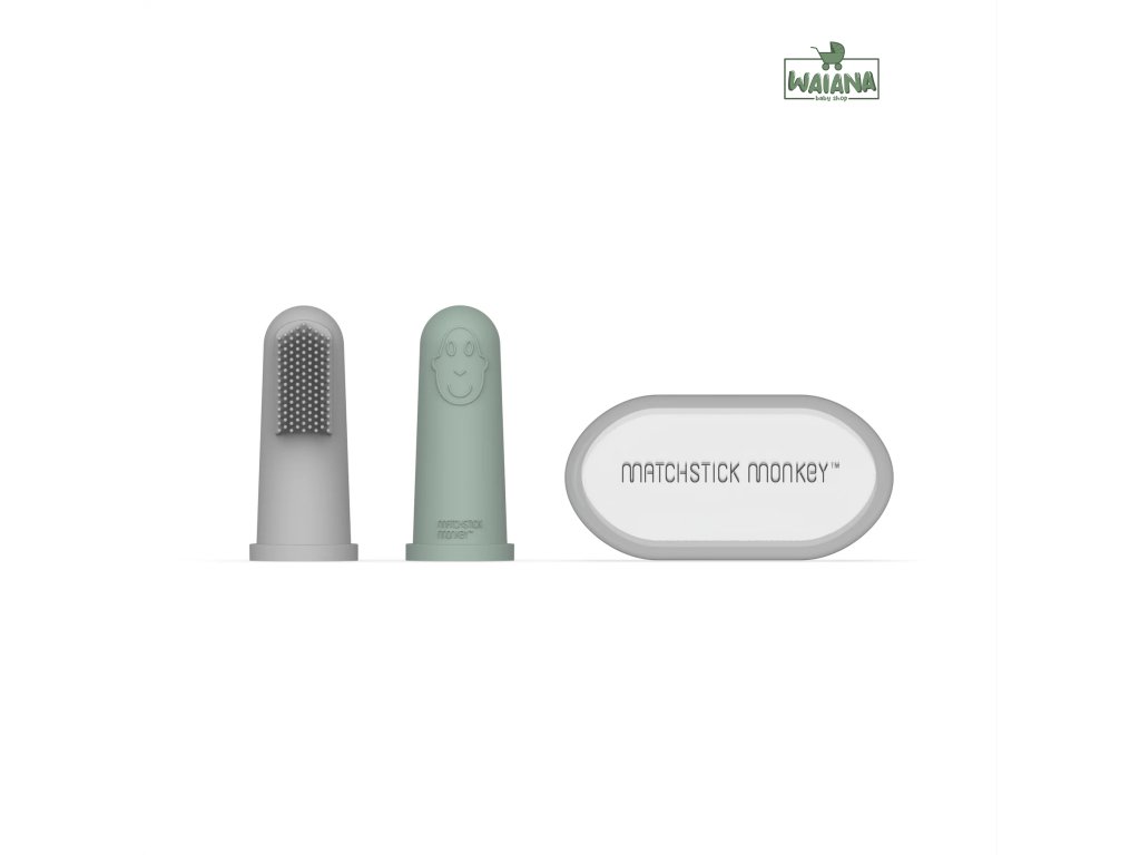 SILIKÓNOVÉ ZUBNÉ KEFKY NA PRST S PUZDROM MATCHSTICK MONKEY - GREY AND MINT GREEN