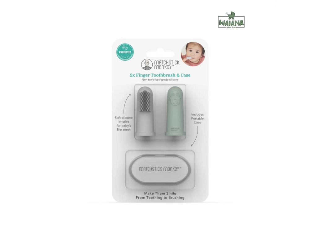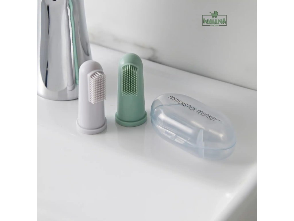 MATCHSTICK MONKEY prstová zubná kefka jemne masíruje a čistí ďasná bábätka už od prvého zúbka a vďaka puzdru je ideálna aj na cesty.