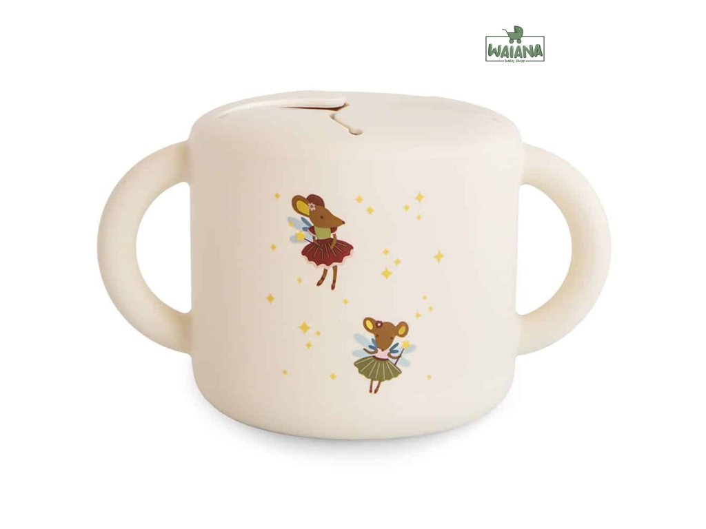 Mushie snack pohárik v jemnej farbe s krásnym dizajnom Fairy Mice.