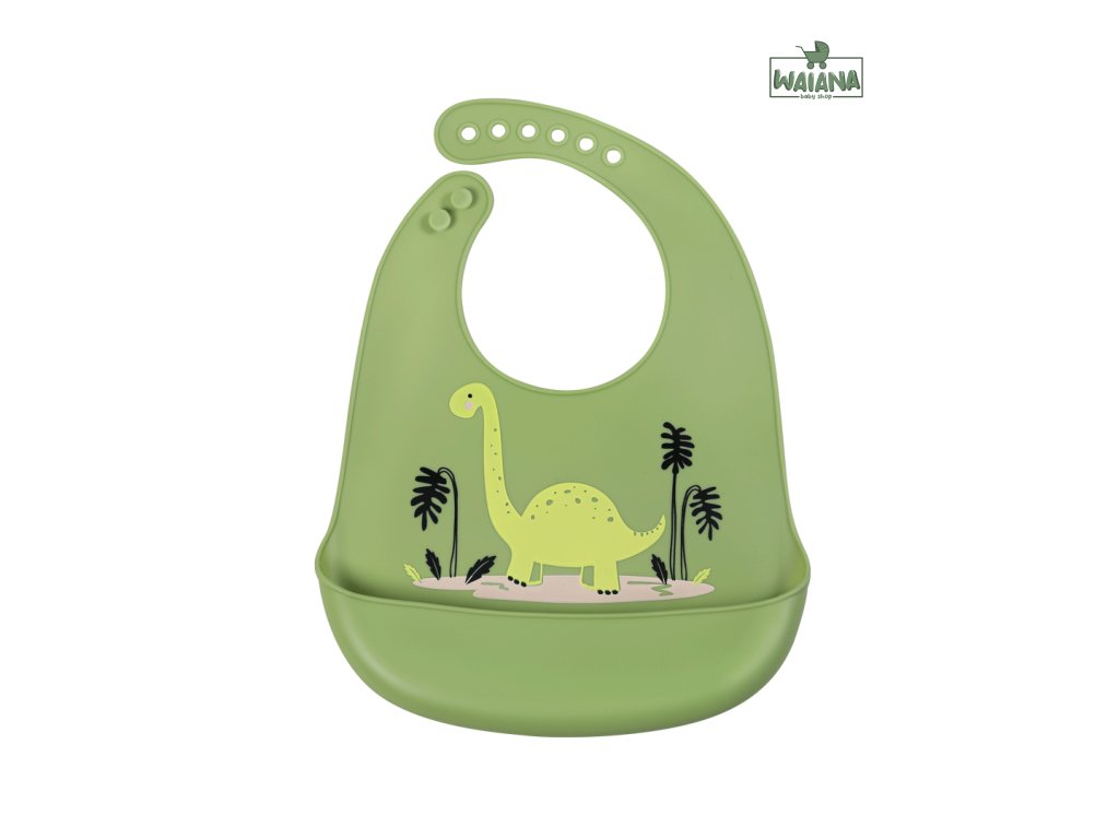 SIMED Silikónový podbradník s vreckom, Green Dinosaur