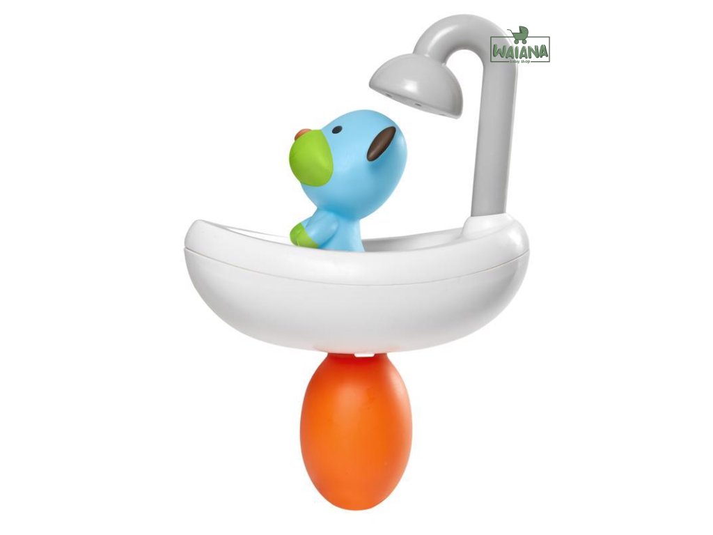 Zábavná hračka do vody. Motivujte dieťatko do kúpeľa prostredníctvom malého psíka, ktorého treba tiež umyť. Stlačením balónika pod vodou dieťa vytlačí vodu, ktorá sa spustí cez sprchovú hlavicu a umyje psíka. Psík je odnímateľný a pláva vo vode.