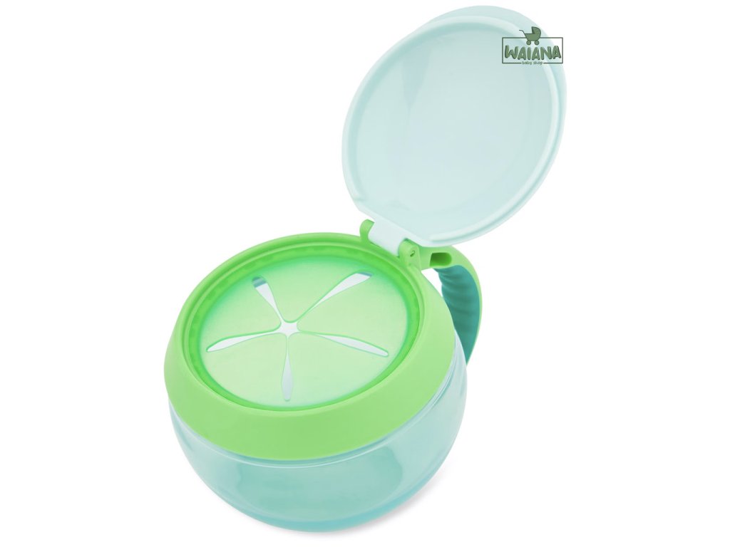Šikovný nápad na cesty. Nádoba má viečko, ktoré po otvorení drží, pred vysypaním obsahu ho chránia pružné lamely, ktoré pustia detskú ručičku dovnútra, ale nepustia desiatu von. Nádoba je priehľadná, aby sa mohla zavčasu doplniť. Na boku je praktické uško v detskom rozmere, pomocou ktorého možno nádobu pripevniť aj na kočík či tašku. 0% BPA, 0% PVC, bez ftalátov. Obsah: 222 ml. Priemer: 10 cm